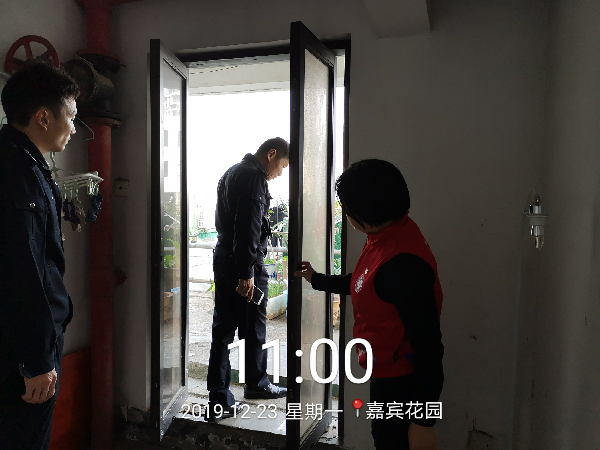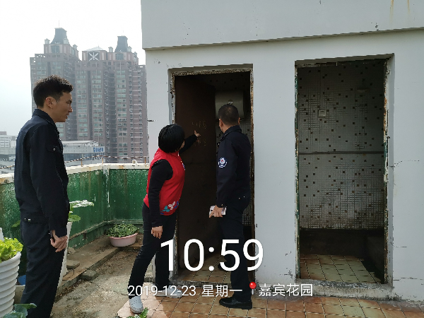 讯:2019年12月23日上午,人民桥社区工作站副站长及网格员在嘉宾花园排查消防通道。
