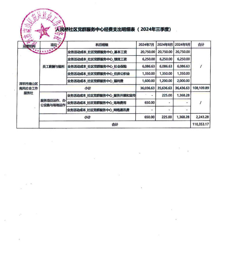 罗湖家园网讯:人民桥社区党群服务中心经费支出明细表(2024年第三季度)如下: