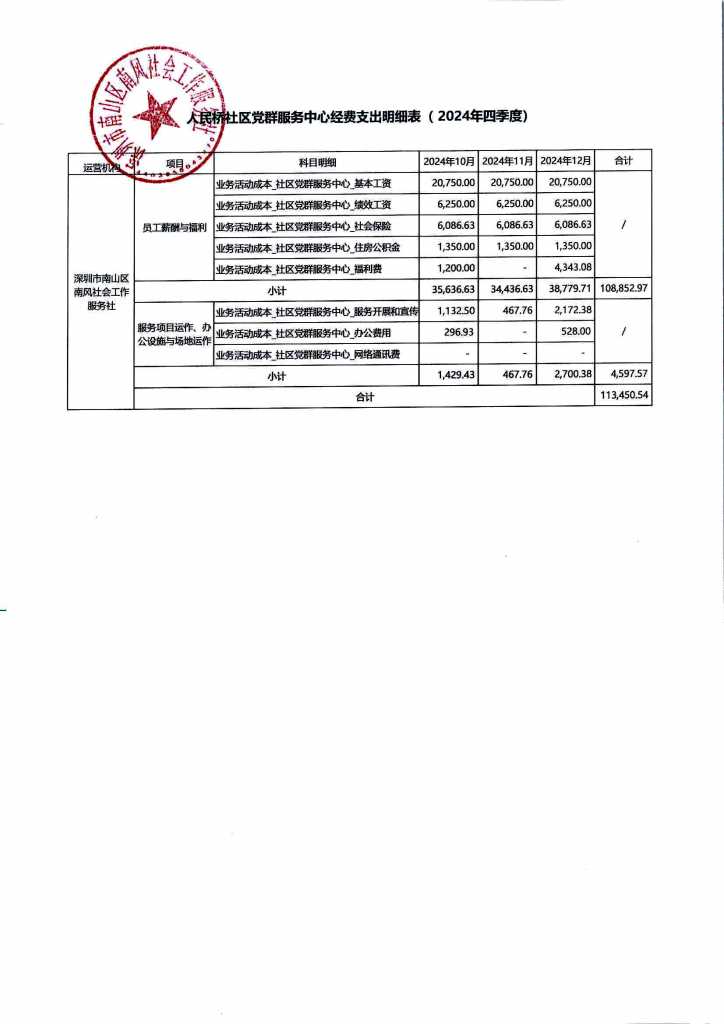 罗湖家园网讯:人民桥社区党群服务中心经费支出明细表(2024年第四季度)如下: