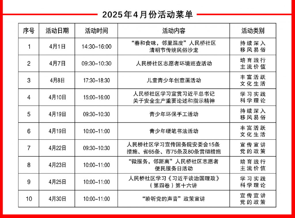罗湖家园网讯:人民桥社区新时代文明实践站4月份活动菜单如下: