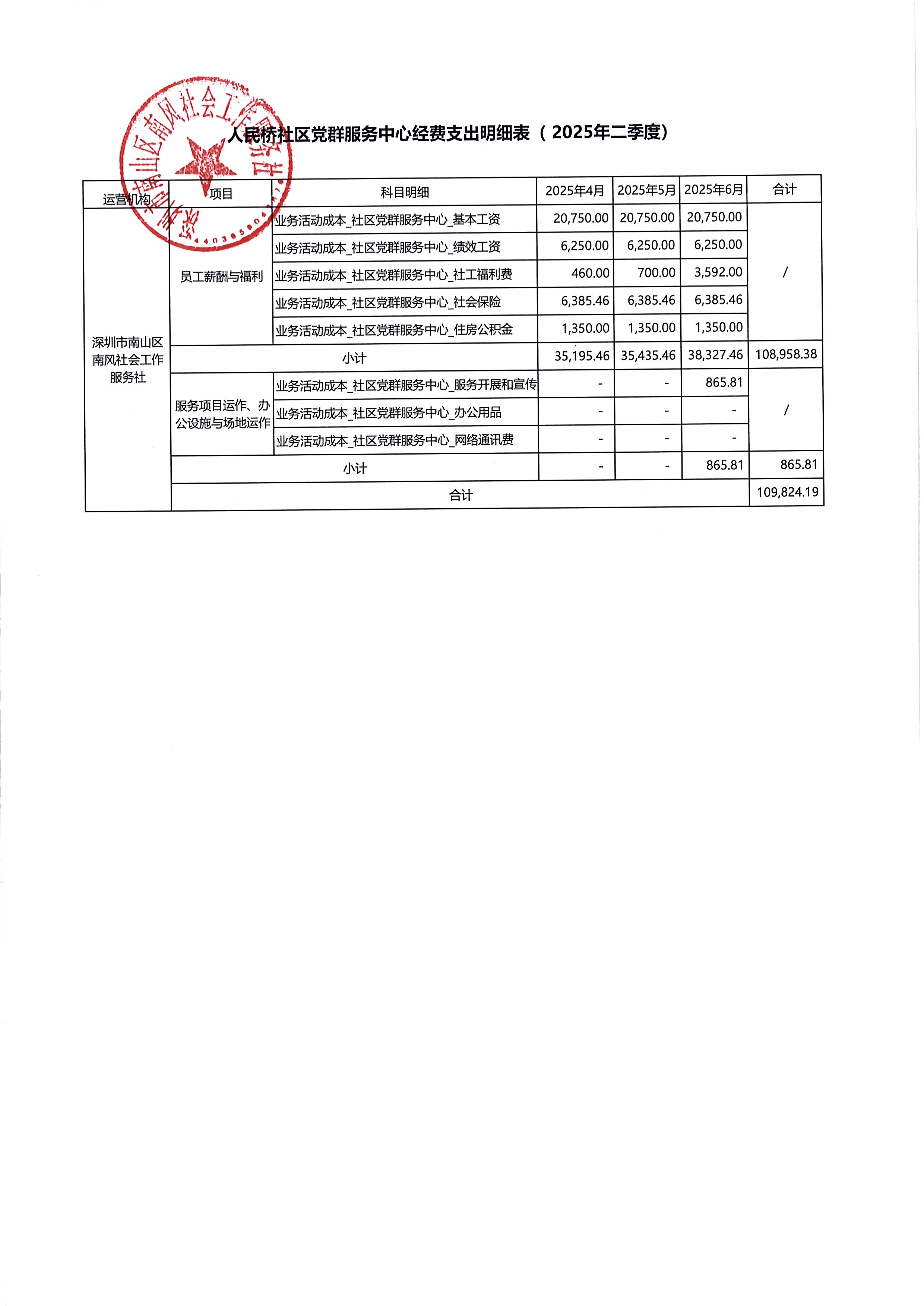 罗湖家园网讯:人民桥社区党群服务中心经费支出明细表(2025年第二季度)如下: