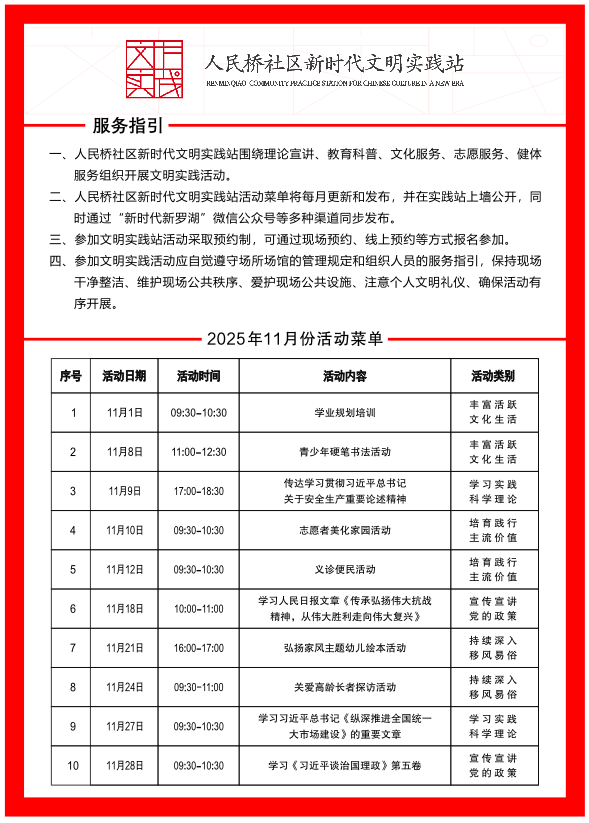 罗湖家园网讯:人民桥社区新时代文明实践站11月份活动菜单如下: