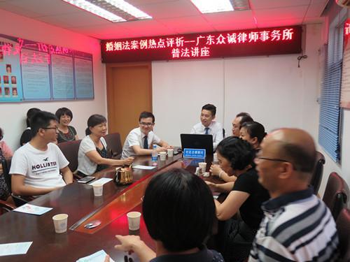 婚姻法是调整婚姻、亲属间权利义务关系的法律。它主要规定婚姻、亲属间身份关系的产生、变更和消灭,以及基于这种关系而产生的民事权利和义务。婚姻家庭是社会的细胞,是组成社会的基本单位。自从家庭诞生以来,人们生活在不同的家庭之中,休养生息,繁衍后代,享受着天伦之乐。家庭的和谐稳定可以说是我们社会和谐稳定的基础。9月27日下午,松园社区联合广东众诚律师事务所陈嘉伟律师开展了“婚姻法案例热点评析”--广东众诚律师事务所普法讲座,社区居民们积极参加。
