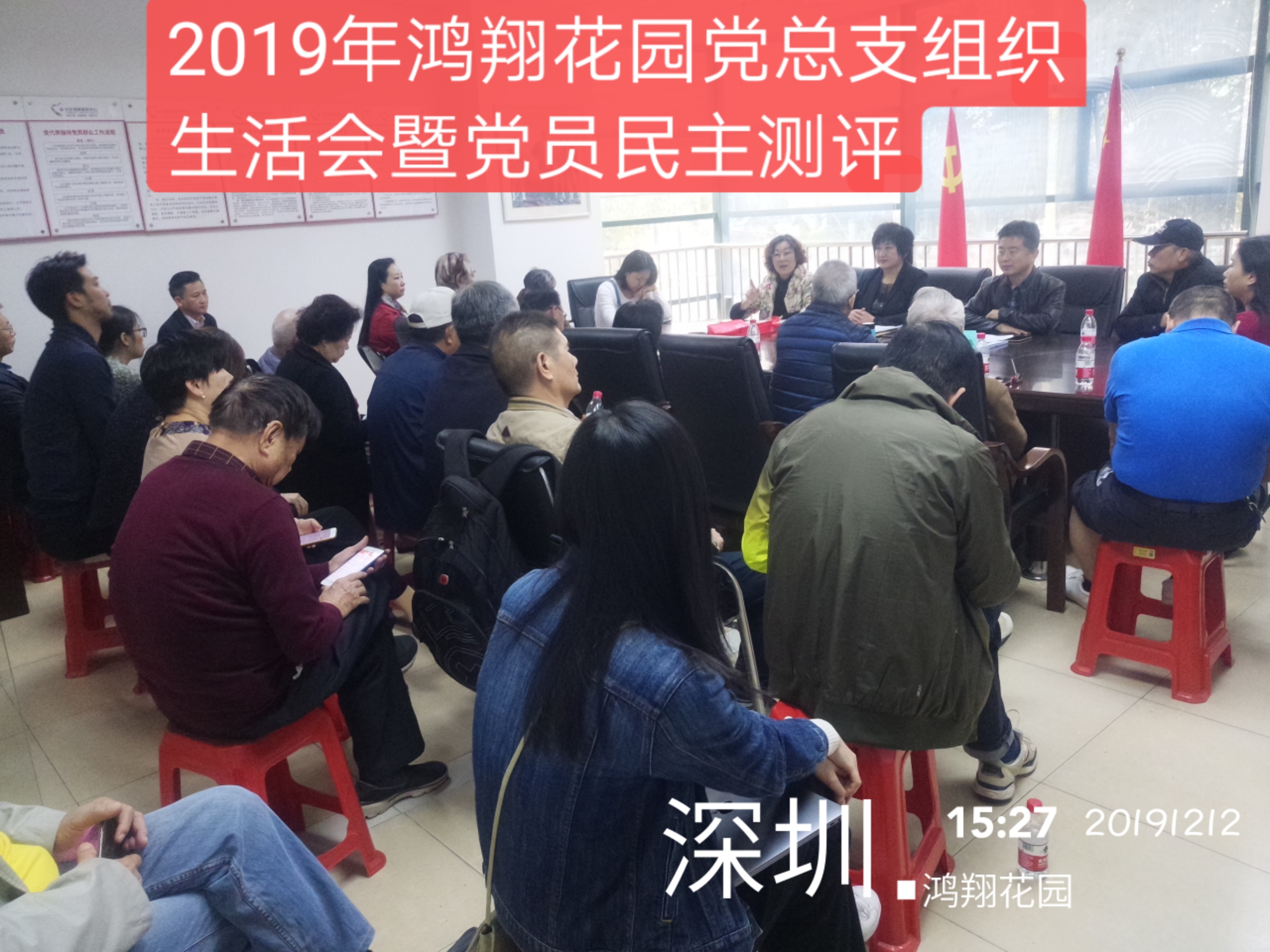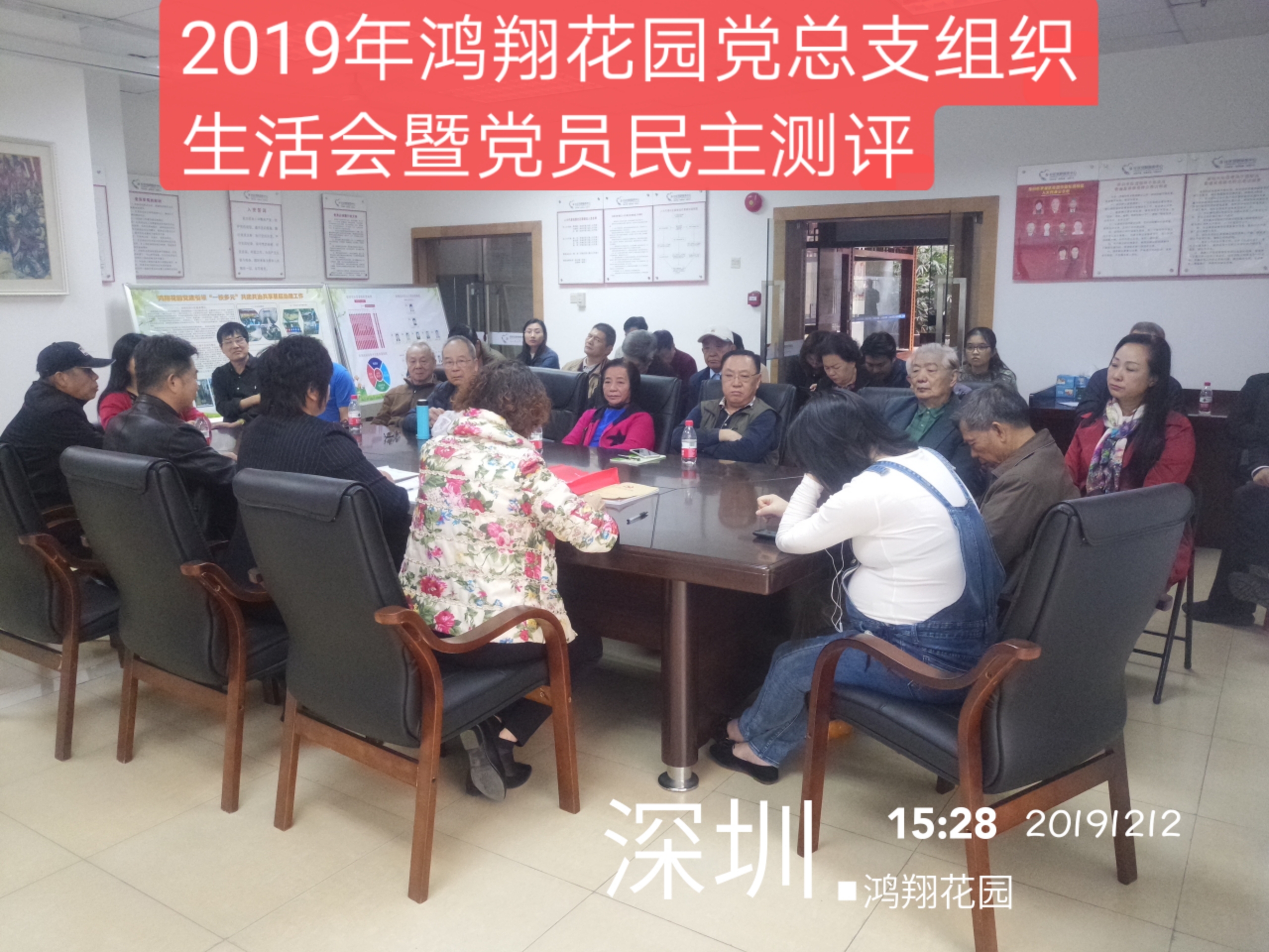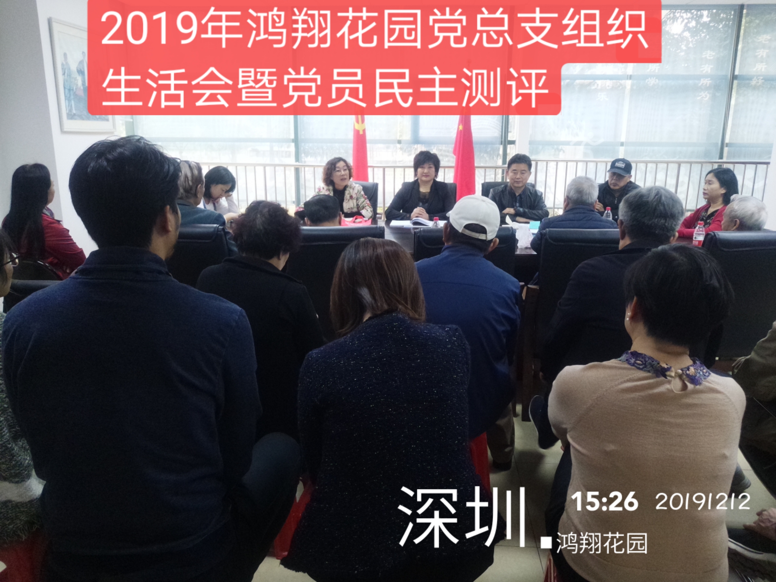 2019年12月12日下午,松园社区鸿翔花园党总支在鸿翔花园党群服务中心二楼党委会议室召开“不忘初心、牢记使命”主题教育专题组织生活会暨党员民主测评会议。