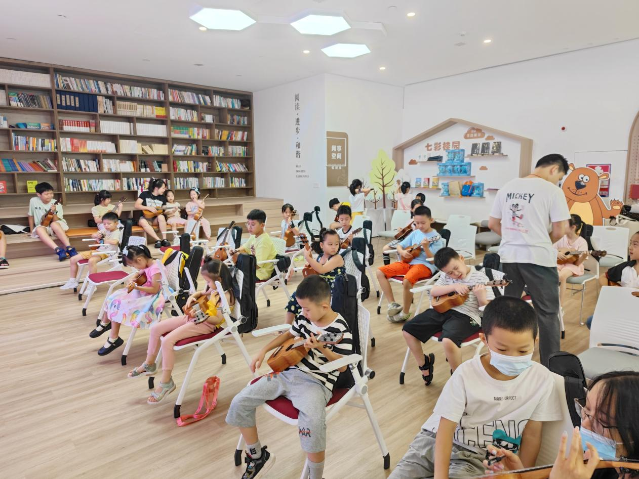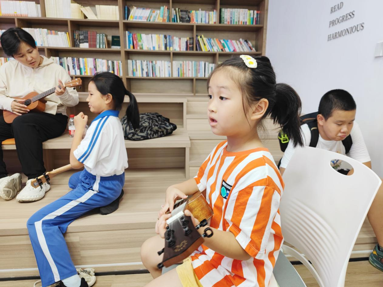 7月中旬,随着尤克里里的学习课程进一步推进,在之前的课程基础上,老师通过热门儿歌弹奏、和弦转换练习等方式,深入讲解了尤克里里的知识。课堂上,同学们专心致志地学习,老师带领着大家一起反复练习各类趣味曲目,促使学生逐渐熟悉掌握尤克里里的弹唱技巧。经过这段时间的学习,学生们已经能弹出不少耳熟能详的歌谣,也对尤克里里产生了兴趣。