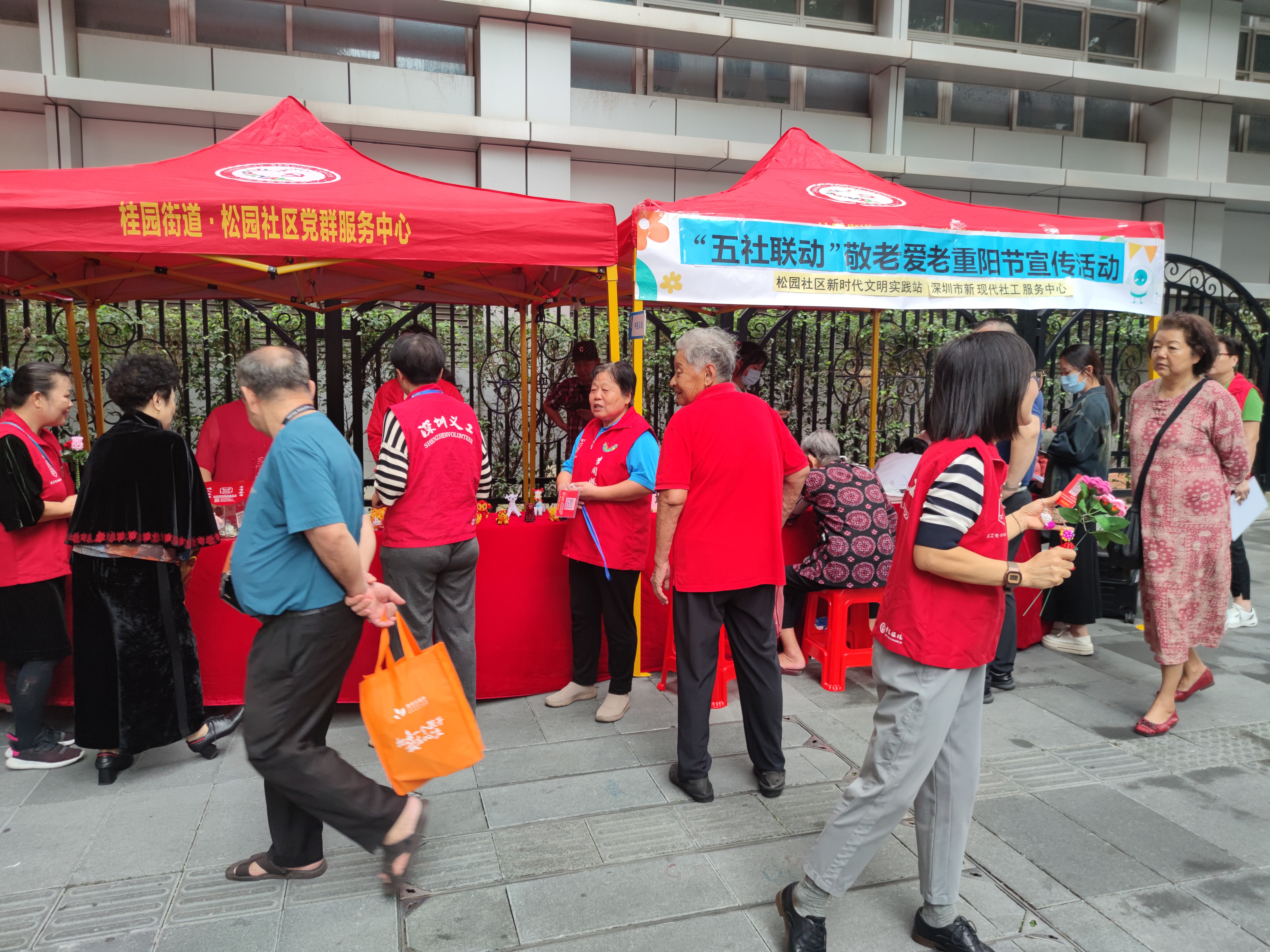 罗湖家园网讯:重阳节来临之际,为弘扬敬老爱老的传统美德,营造关爱长者的社区氛围,2023年10月18日下午,松园社区新时代文明实践站、深圳市新现代社工服务中心在电器公司旁广场开展松园社区“五社联动”敬老爱老重阳节宣传活动。