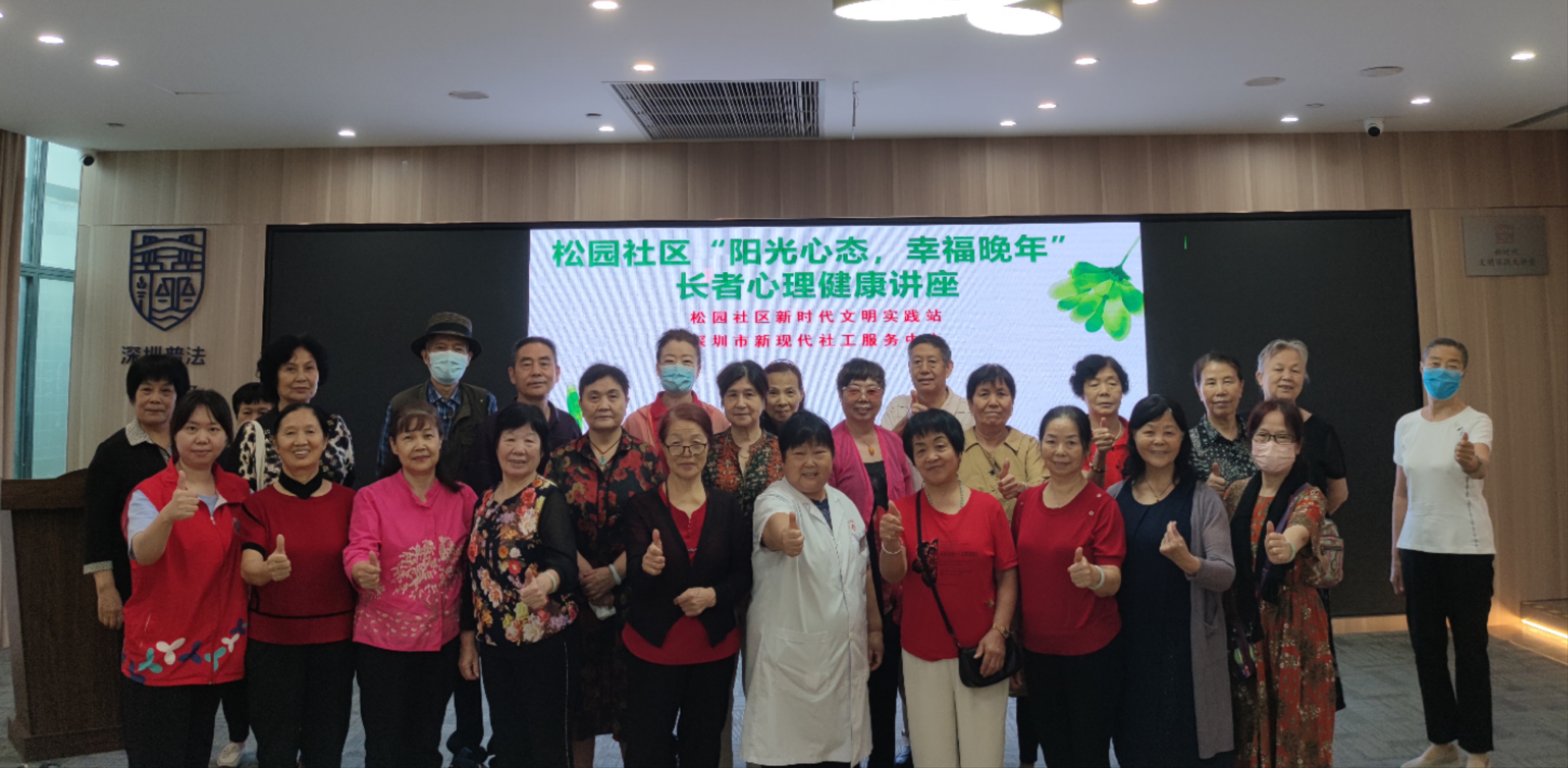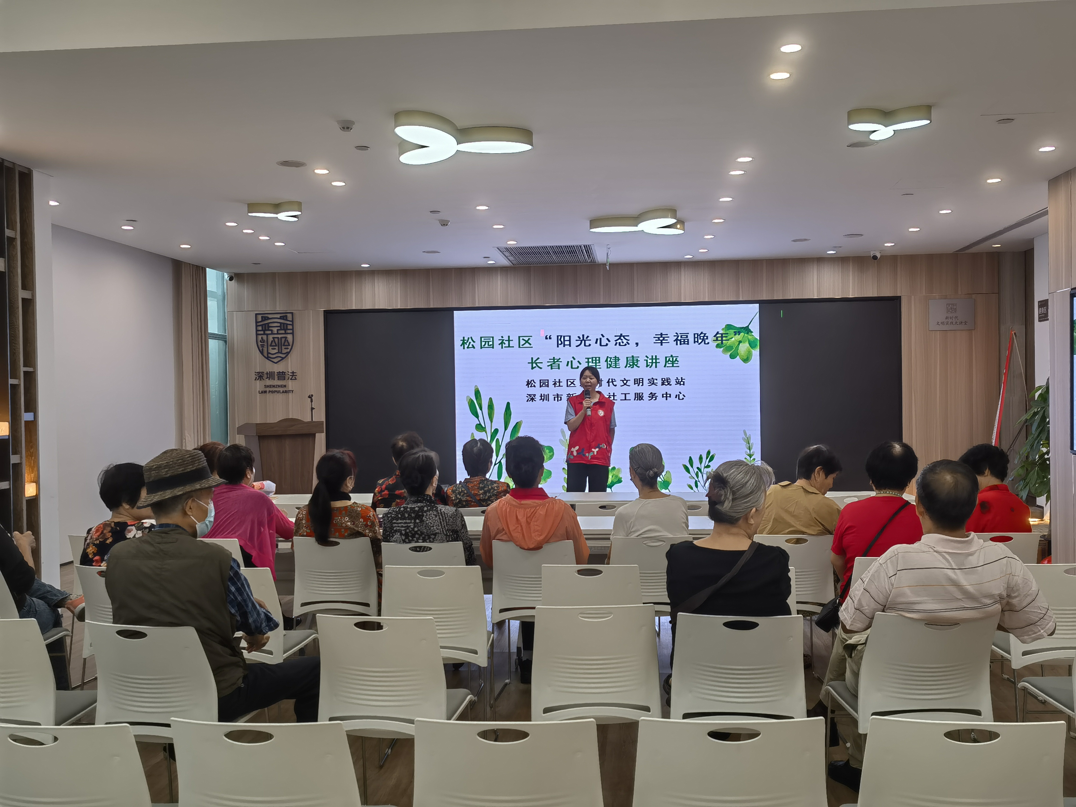 罗湖家园网讯:为了促进社区长者的心理健康,2023年11月9日上午,松园社区新时代文明实践站、深圳市新现代社工服务中心在国速中心五楼开展“阳光心态,幸福晚年”松园社区长者心理健康讲座,25名长者参加了此次活动。