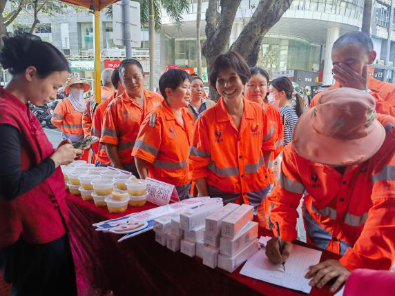 居民们在享受便民服务的同时,志愿者们也为居民端上一碗碗热气腾腾的汤圆,居民们连声说道“一碗汤圆,一份吉祥”,人人脸上洋溢着欢快的笑容。元宵节寄托着社区居民祈盼幸福平安的美好希望,居民们一边品尝美味的汤圆,一边感受着节日的浓浓氛围。最后辖区内招商银行对环卫工人进行了慰问。