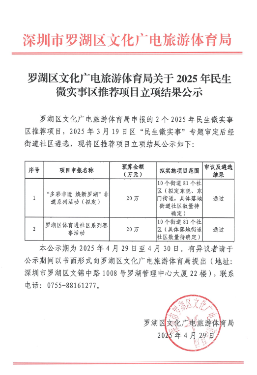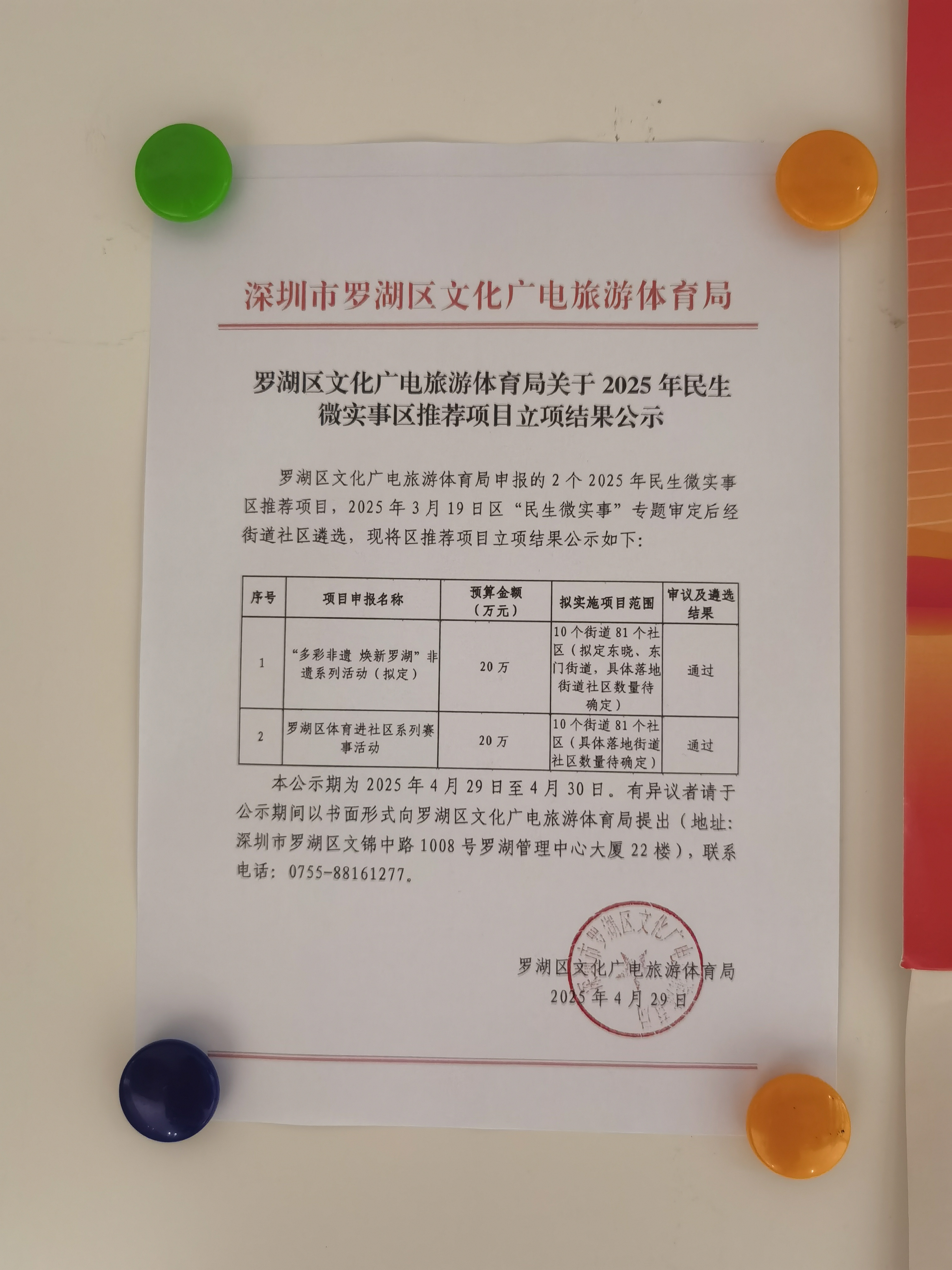 罗湖区文化广电旅游体育局关于2025年民生微实事区推崇项目立项结果公示