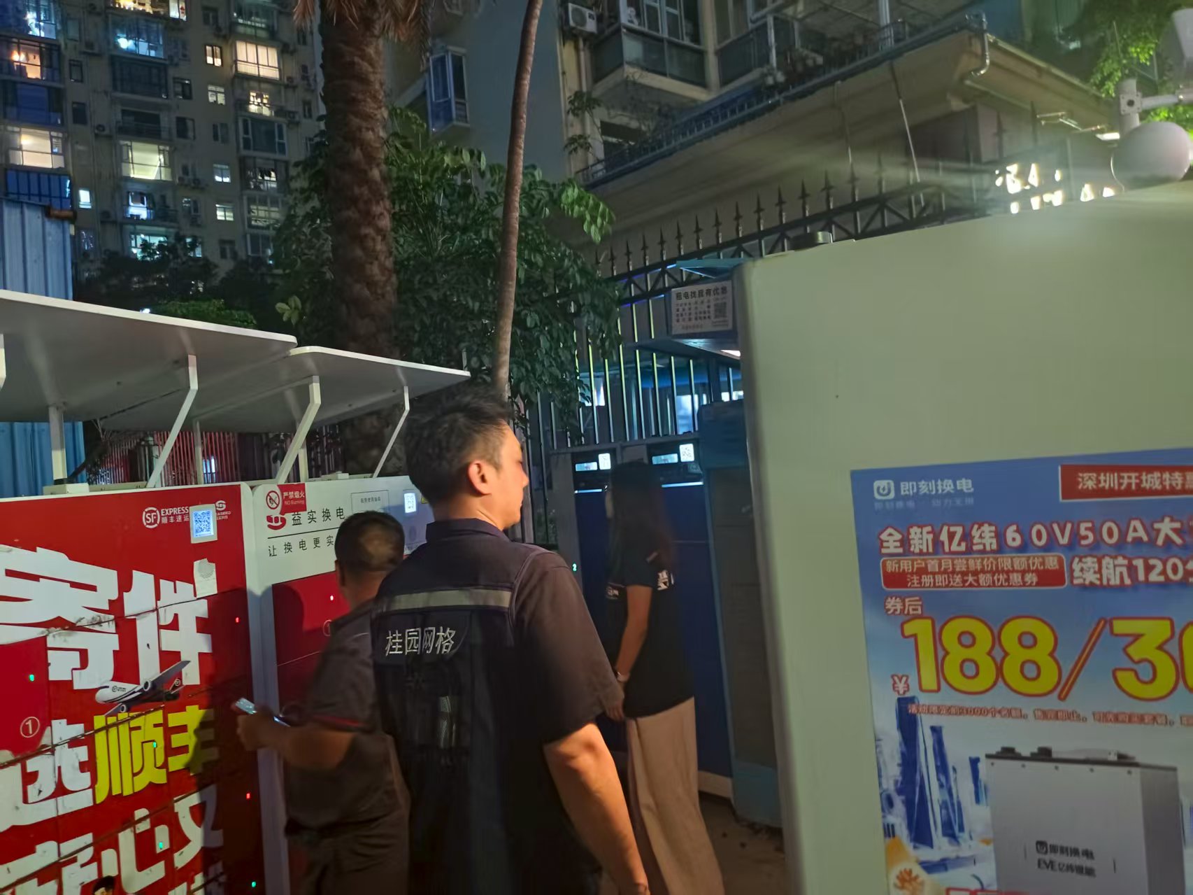 罗湖家园网讯:夏季高温天气下,电动车充电安全隐患凸显。为切实保障居民生命财产安全,7 月 17日夜间,松园社区网格员人员组成专项巡查组,对辖区内电动车充电桩及电池换电柜开展夜间消防安全突击检查。