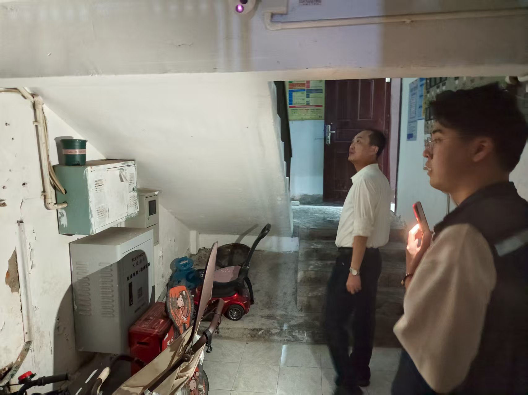 随后,检查组深入小区的楼道,排查消防器材是否完好、有无被遮挡。