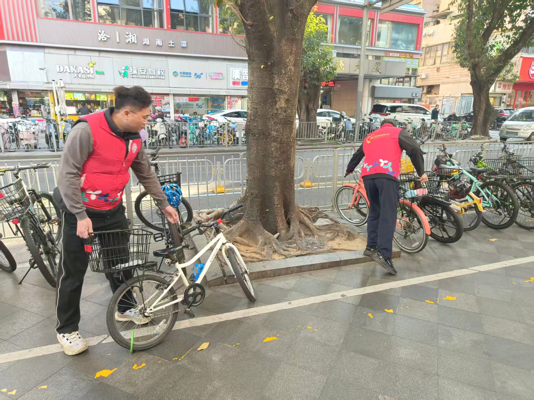此次行动针对性梳理辖区重点区域,工作人员分组对商圈周边、公交站点、小区出入口及主次干道两侧进行全面排查。针对随意停放在人行道、绿化带、消防通道内的共享自行车,大家齐心协力逐一搬运、规范摆放,将车辆有序归置到指定停车区域,确保车身排列整齐、不占用通行空间,同时清理掉夹杂在车辆间的垃圾杂物,还原道路整洁原貌。