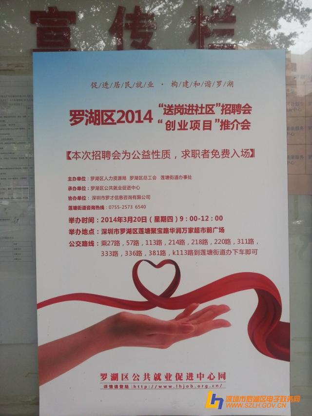 新围社区张贴《罗湖区2014“送岗进社区”招聘会、“创业项目”推介会》海报