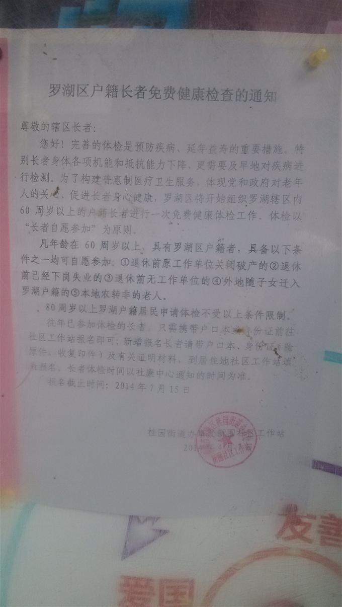 新围社区张贴《罗湖区户籍长者免费健康检查的通知》
