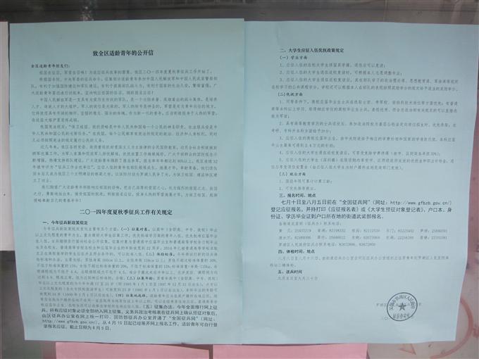 新围社区张贴《致全区适龄青年的公开信 二〇一四年度夏秋季征兵工作有关规定》通知