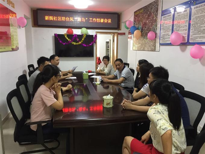 2016年10月20日下午,街道党工委副书记、纪工委书记曾惠卿带领新围驻点团队成员到新围社区,组织召开防台风“海马”工作部署会议,组织人员到各管理处派发温馨提示,要求各单位密切关注市气象台最新预报和预警,做好预防台风暴雨安全生产工作,对各自服务区域进行全面安全隐患排查整治;严防自然灾害引发生产安全事故,会议结束后到滨河中学工地、滨苑小区工地、新十坊25栋等进行台风隐患安全排查,对并对辖区范围内的遮阳棚、广告牌、树木等易造成伤亡地点进行全面排查,对存在隐患进行上报。
