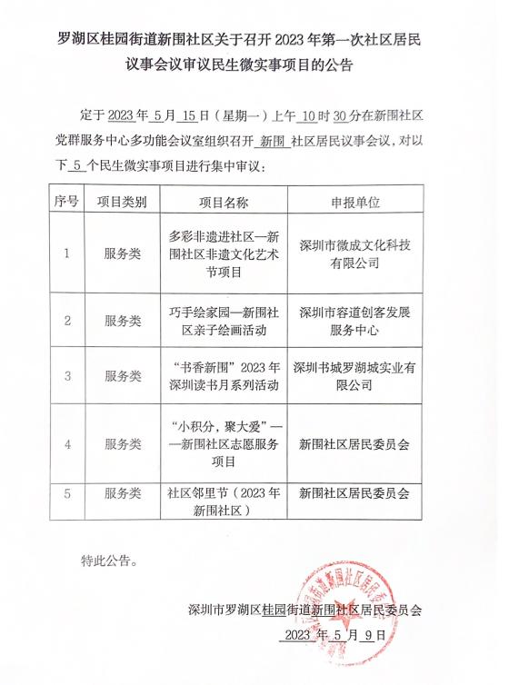 罗湖区桂园街道新围社区关于召开2023年第一次社区居民议事会议审议民生微实事项目的公告