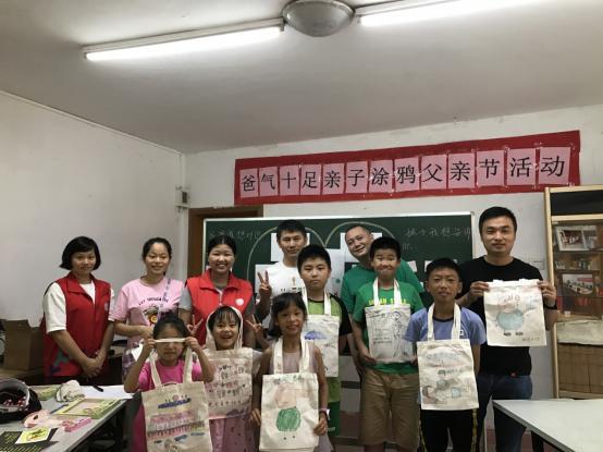 此次活动主要是父亲与孩子一起在帆布包上进行绘画涂鸦。在开始前通过让大家抽取欧卡卡片描述故事的形式让大家自我介绍并表达出自己的想法,接着为每个人分发了所需的道具,在绘画过程中有的孩子按照给出的一些模板画了父亲与自己,有的孩子画了蛋糕写着祝爸爸父亲节快乐,也有孩子发挥自己的想象进行了创作。