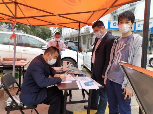 社区第一书记和社区工作人员巡查辖区单位和门店