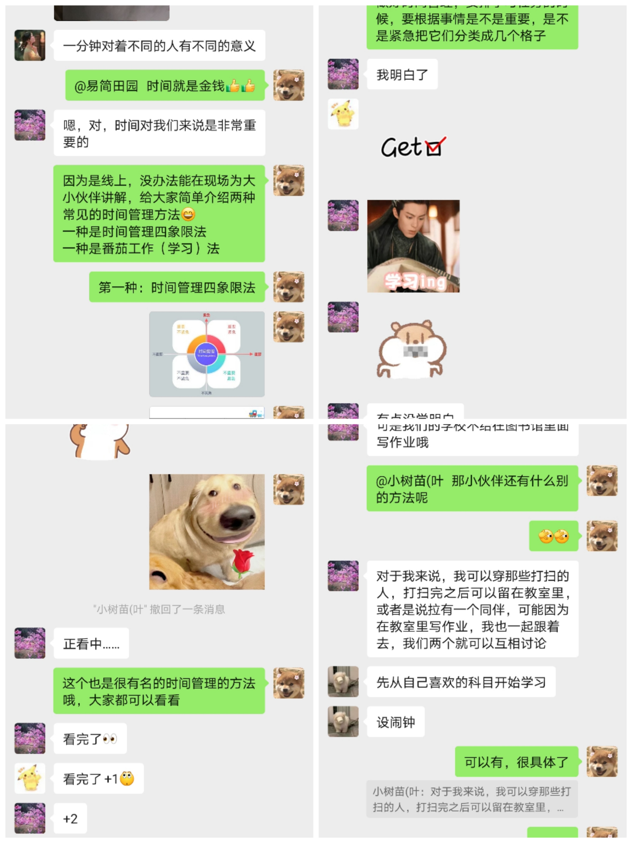 活动中,社工通过“时间都去哪儿了”短视频讲解,启发青少年对自己日常学习、生活时间安排的思考。紧接着,在头脑风暴和手绘环节,社工引导参与者联想关于时间的具象事物并动手绘画,参与的青少年纷纷开动脑筋,用纸笔表达自己心目中的“时间”。此外,社工也向参与活动的青少年介绍了时间管理的一些科学方法,如“时间管理四象限法”、“番茄学习(工作)法”等,同时鼓励社区青少年互相讨论和分享自己有效利用时间、拒绝干扰和诱惑的小妙招,让其在学习和互动交流中学会珍惜时间、培养合理分配和使用时间与精力的好习惯。