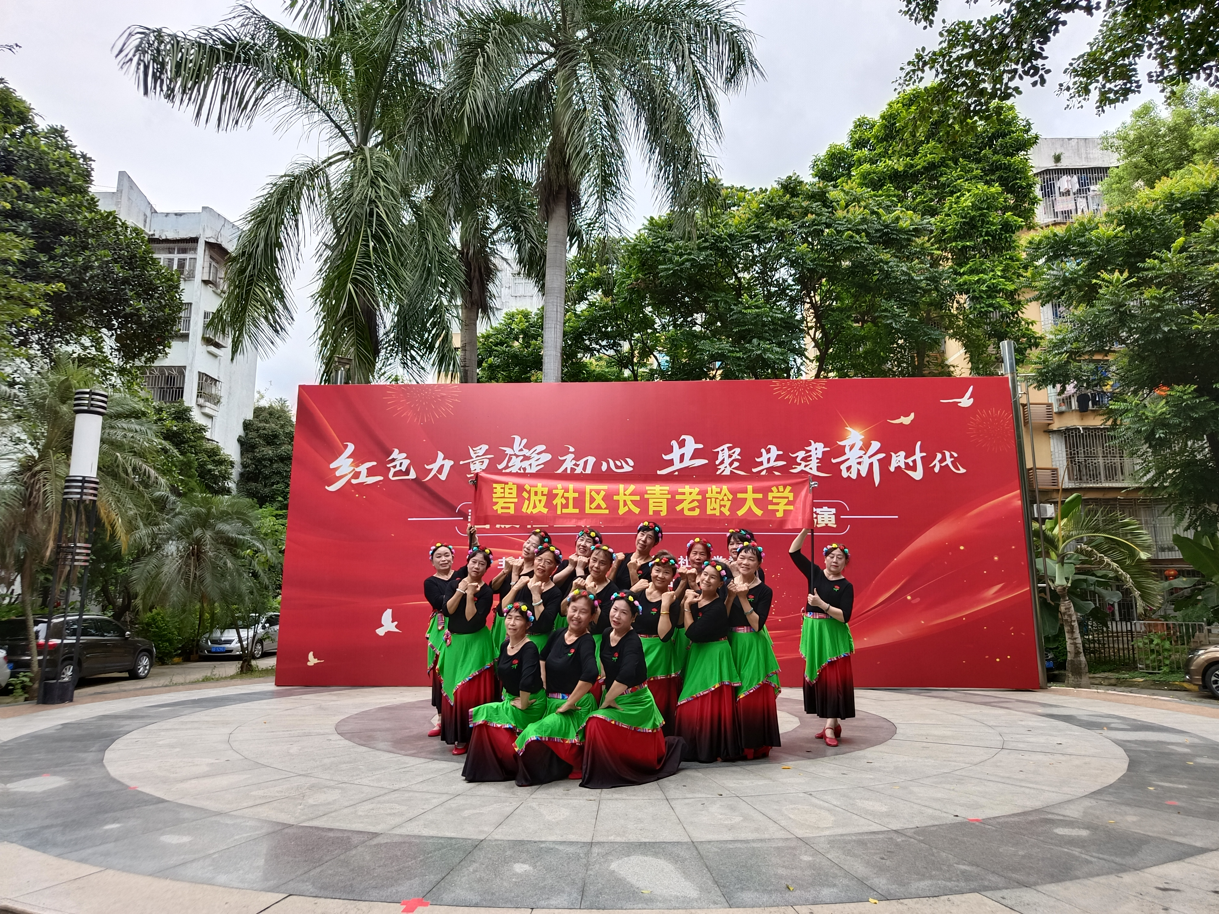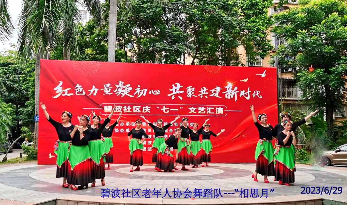 由于学员们的基础不同,有些几乎是零基础。老师根据实际情况及老年人的特点,认真备课,耐心辅导,基本功要领逐一示范教学,使学员们逐步掌握要领,协调平衡,并用心理解舞蹈的内在涵义。通过勤奋学,刻苦练,将“山坡坡”演绎得俏皮、灵动。将“茉莉花”演绎的悠扬、柔情。将“相思月”演绎的深情、优美。同年“相思月”舞蹈参加了碧波社区党委主办的“红色力量凝初心,共聚共建新时代”碧波社区庆“七一”文艺汇演。学员们以饱满的热情,用无比崇高的民族自信心,歌颂我们伟大的党,舞动祖国的新时代,学习宣传贯彻党的二十大精神,各民族大团结,奋力迈进新征程。