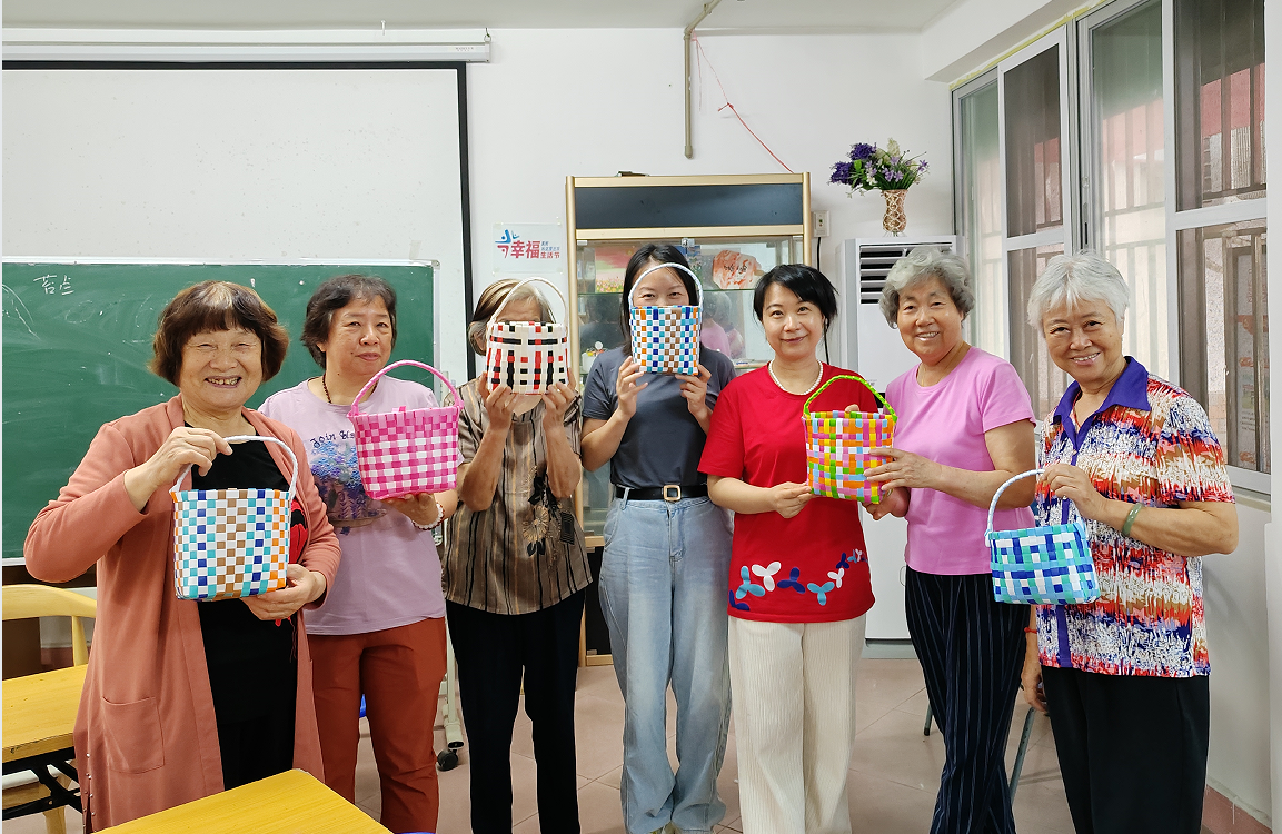 在制作过程中,社工也不时为长者们提供必要的帮助和支持,协调每个小组的长者学习手工。经过大家的共同努力,一个个精美的“菜篮子”开始慢慢呈现,看着自己亲手制作的作品,长者们脸上洋溢着自豪和喜悦的笑容。