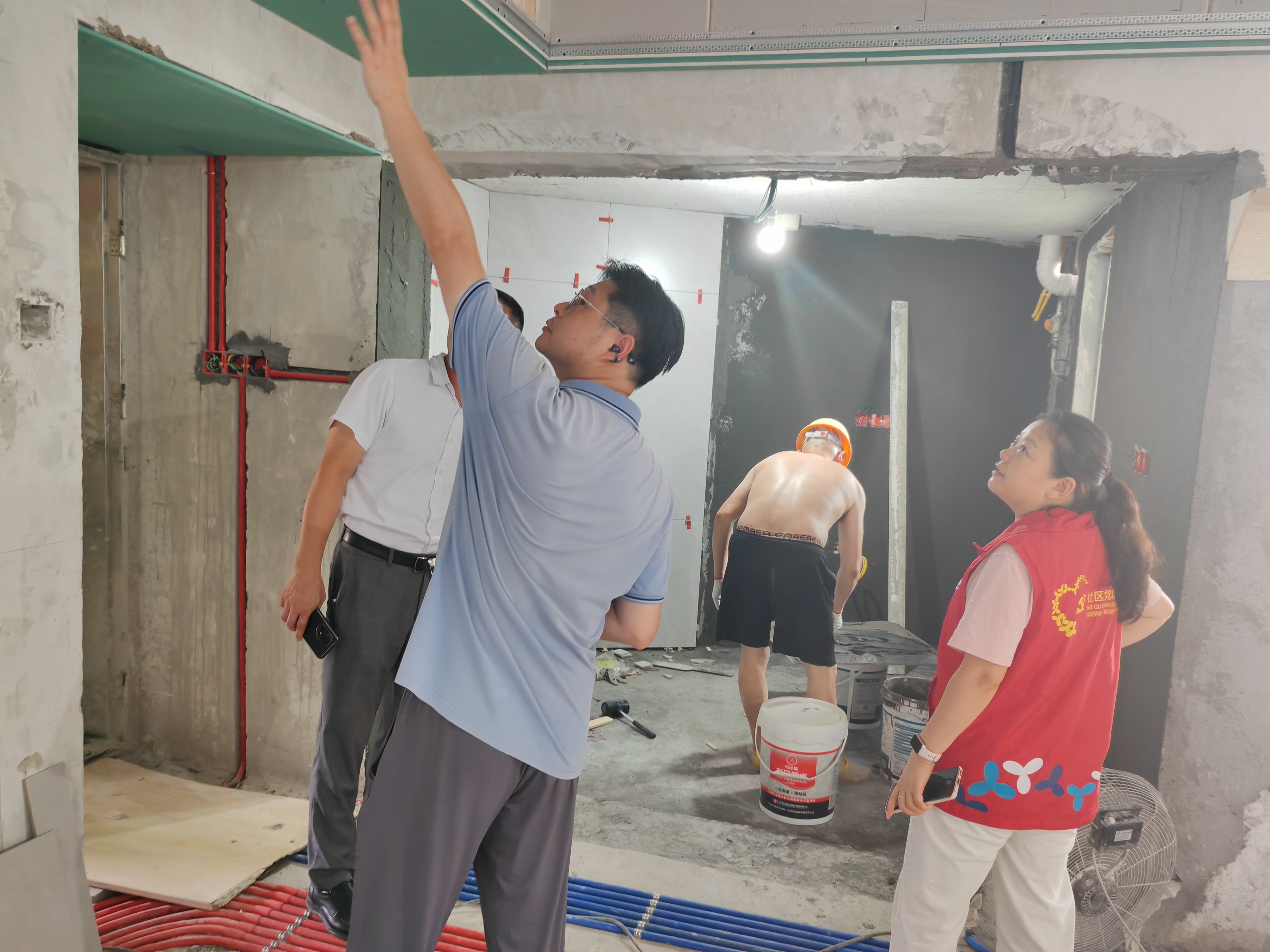 罗湖家园网讯:8月11日,碧波社区网格员巡查碧湖阁室内装修。