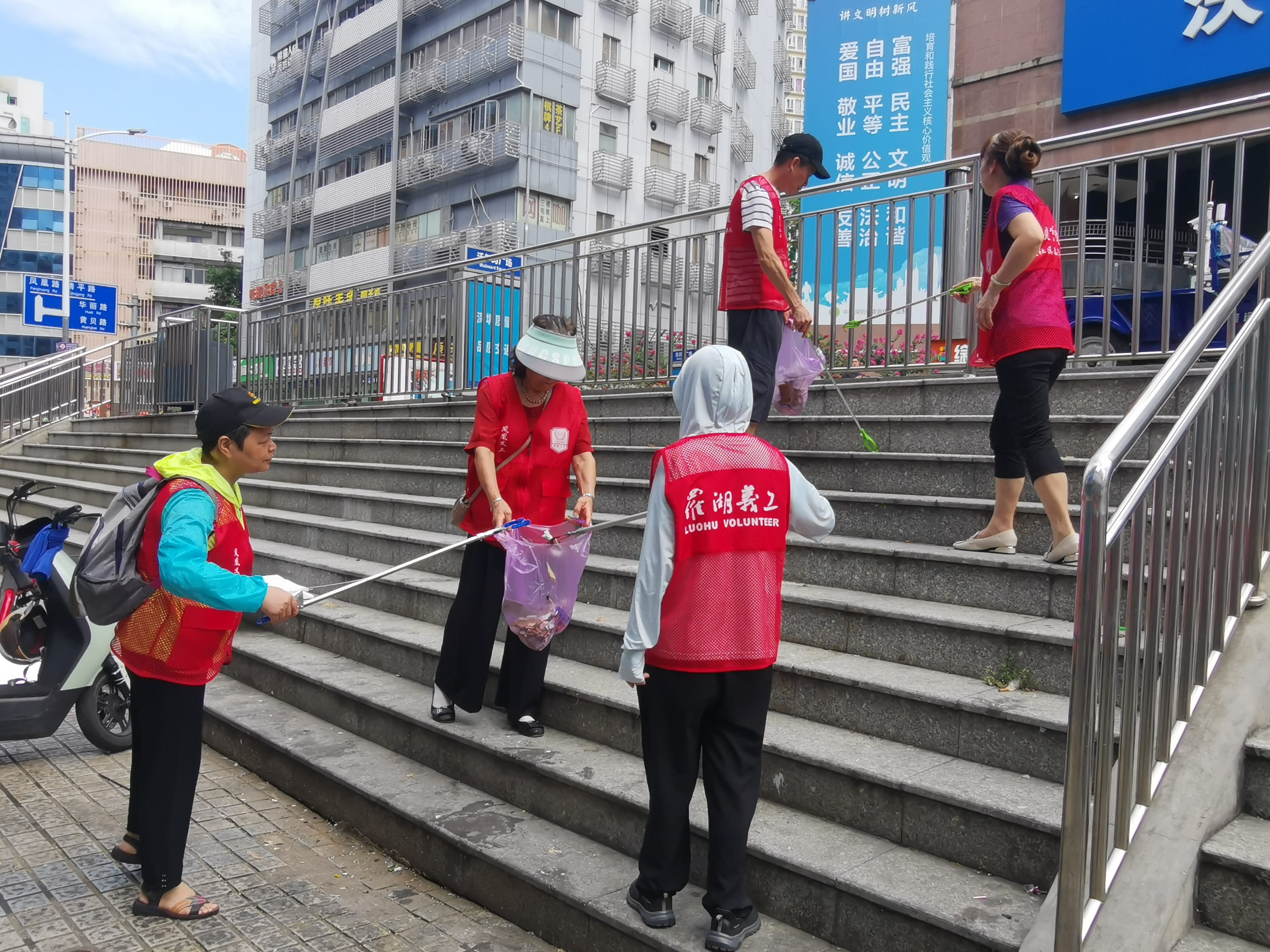 以志愿者组成的志愿服务队,手持清洁工具,沿着街区主干道展开巡查。大家认真清理道路两旁的烟头、纸屑、塑料瓶等垃圾,不放过任何一个卫生死角。同时,志愿者们还对街边商户进行了环保宣传,劝导大家落实 “门前三包” 责任,共同维护街区环境。在巡查过程中,志愿者们还发现了一些基础设施损坏问题,如路面坑洼、商场对面台阶垃圾过多等,及时反馈给现场工作人员。