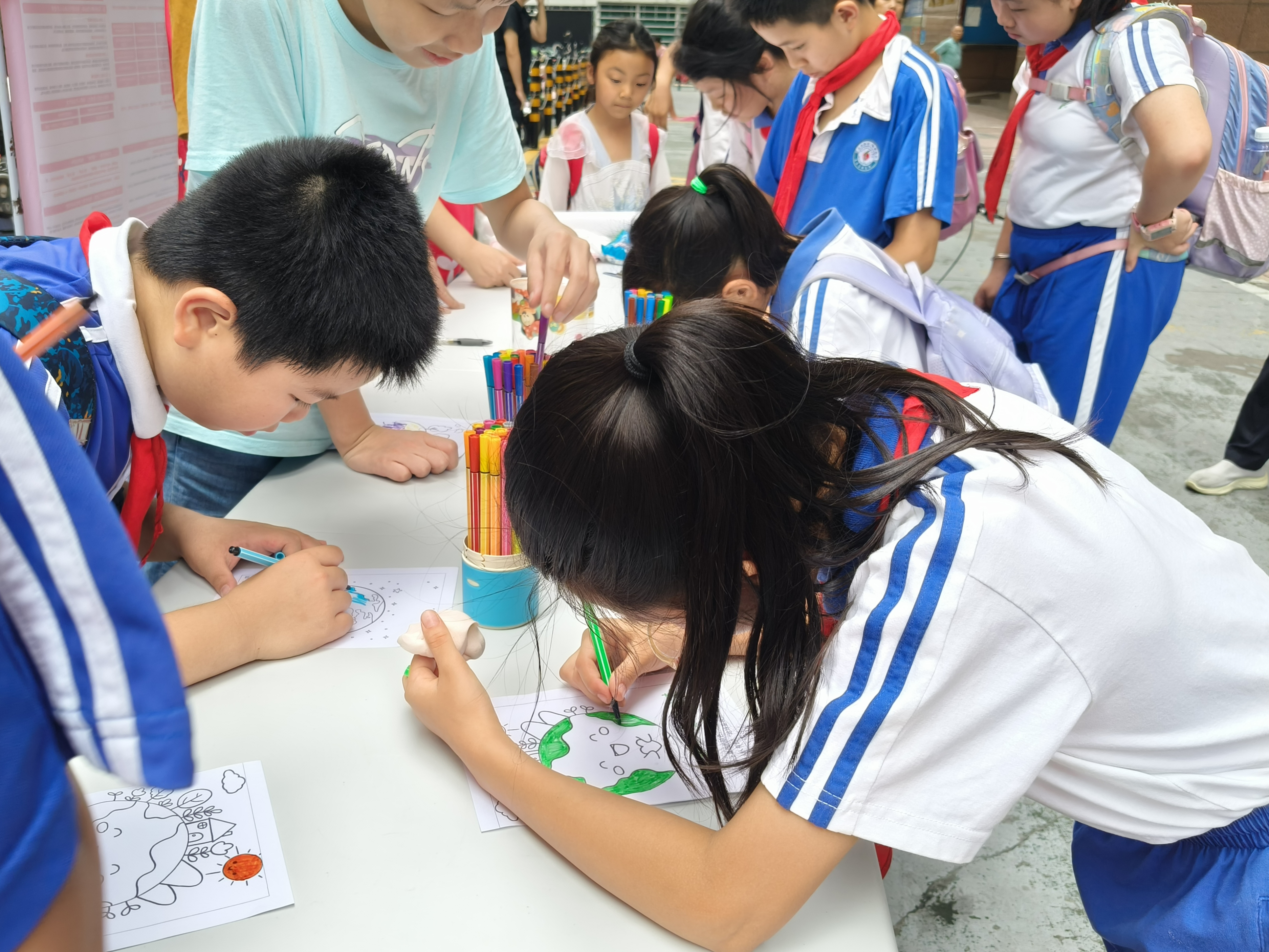 活动现场,刚刚放学的小朋友们成为一道亮丽的风景线。他们手握水彩笔,专注地为 “地球” 涂色,让白色的纸张焕发出五彩生机,随后又一笔一划写下“地球是我家,美丽靠大家”“保护环境,人人有责”等爱护地球的口号。完成作品后,小朋友们兴奋地与同伴或新结识的小伙伴一起合影留念,还满心欢喜地领取了自己喜欢的小奖品,现场洋溢着童真与欢乐。