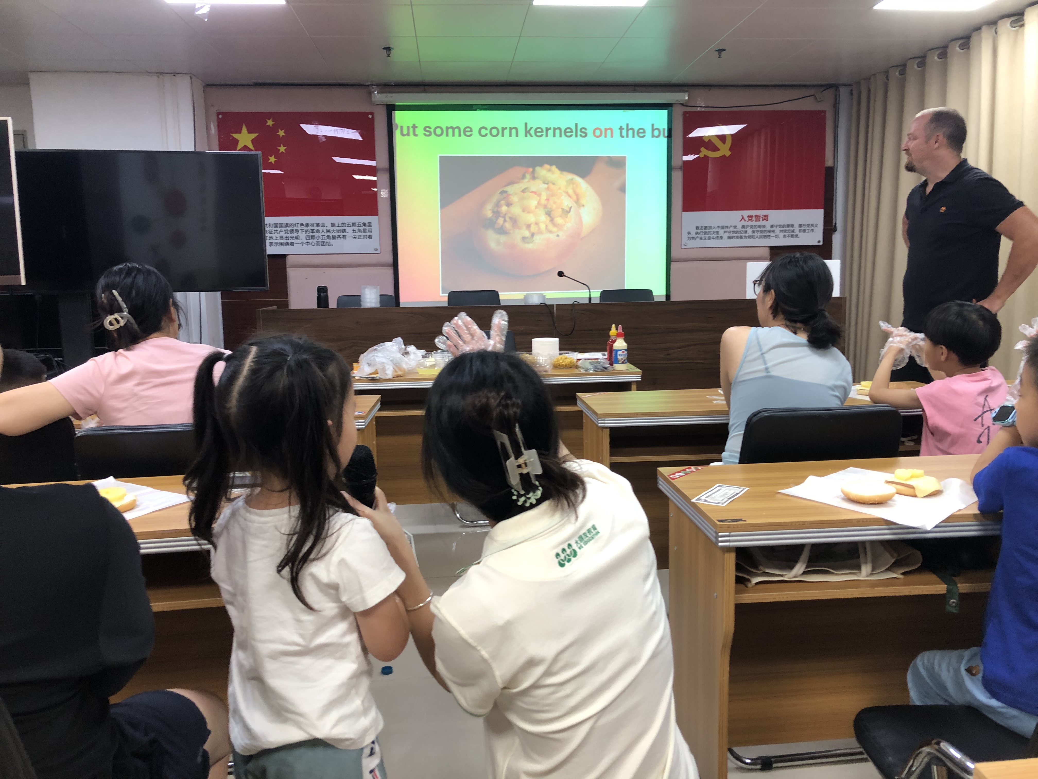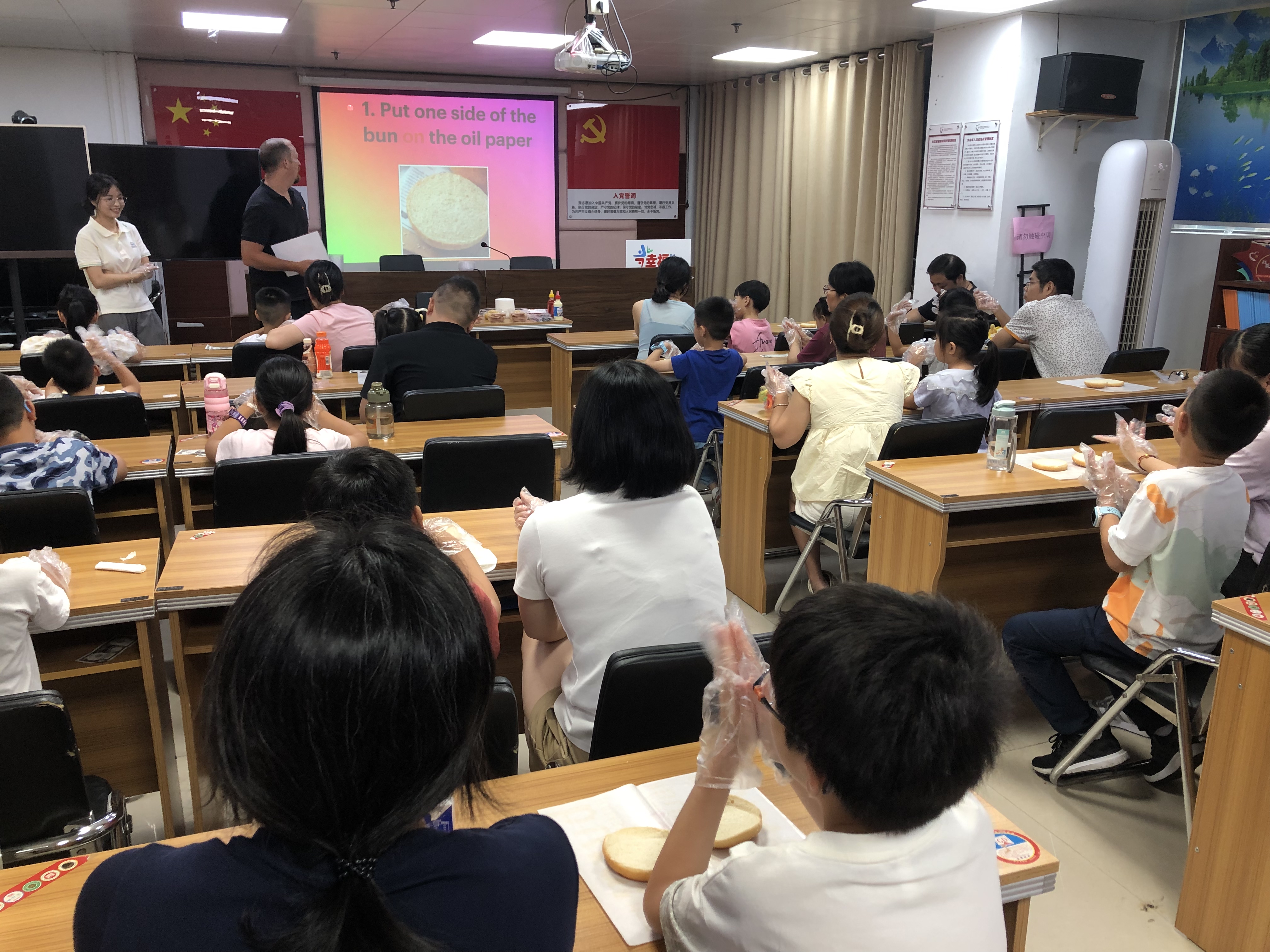 活动现场,外教老师引导亲子家庭分组协作,共同完成手工汉堡的制作。从挑选食材、准备配料到组装汉堡,每一个环节都融入了丰富的英语元素。外教老师用生动有趣的方式,教亲子家庭学习与汉堡制作相关的英语词汇和句子。