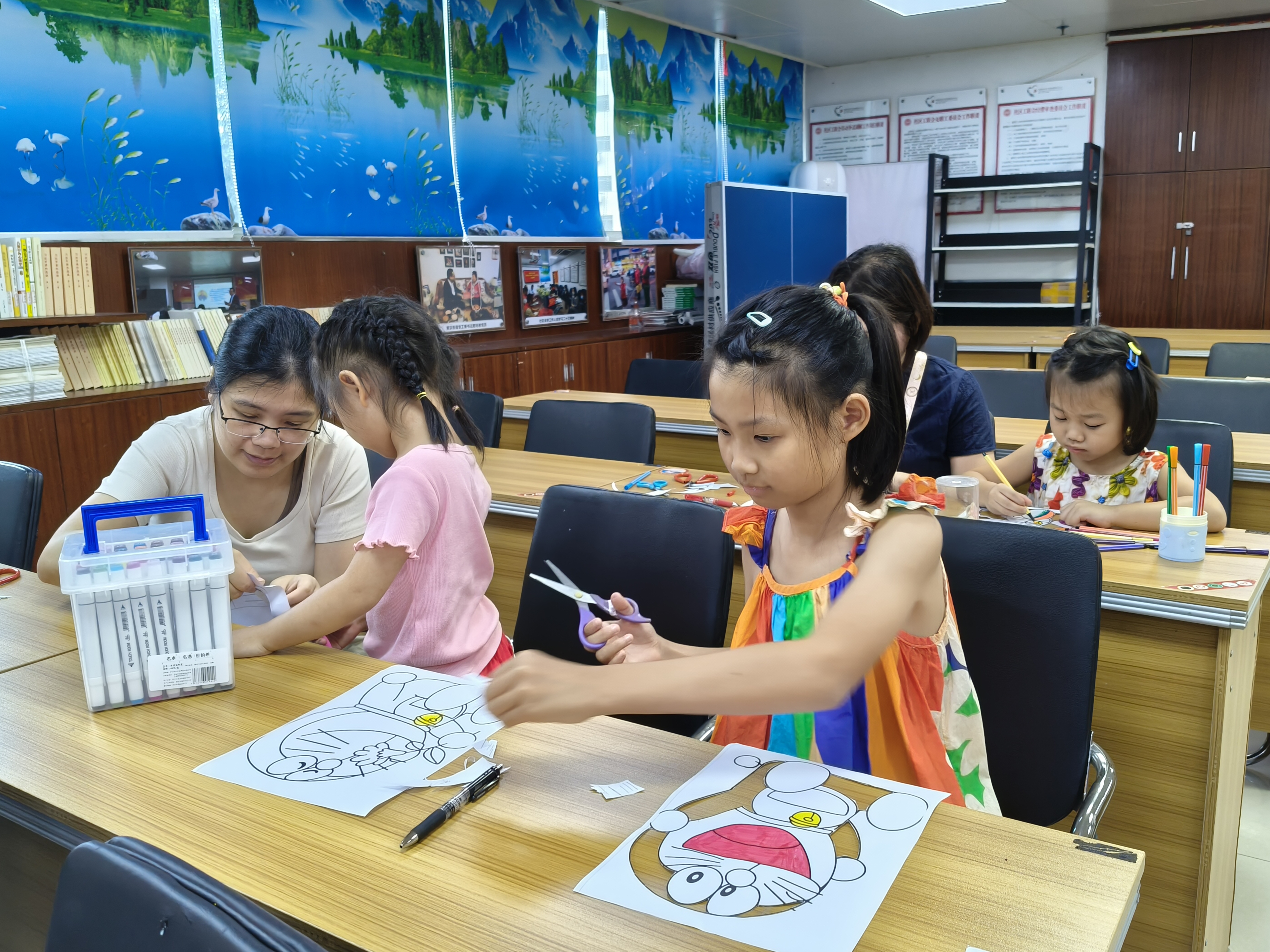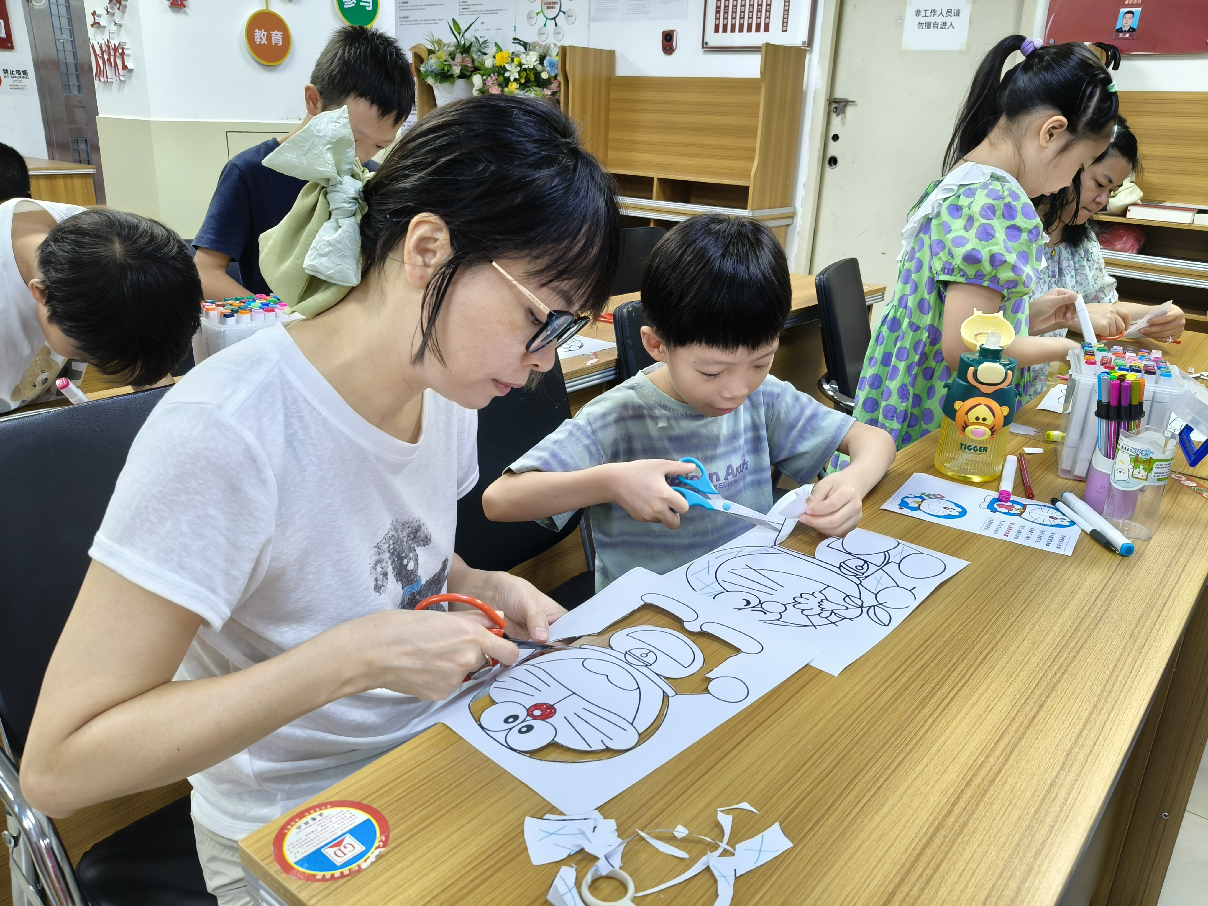 活动开场,社工详细介绍了活动规则,为亲子家庭们分发了剪刀、纸、笔等工具,并现场演示剪纸技巧,让大家对剪纸艺术有了初步认知,也为后续创作筑牢基础。在创作环节,以深受孩子们喜爱的哆啦A梦为主题,家长与孩子默契配合。孩子们兴致勃勃地勾勒着哆啦A梦的轮廓,眼神中满是新奇与期待;家长们则在一旁辅助,引导孩子如何安全使用剪刀,适时给出建议,帮助孩子完成较为复杂的剪裁部分。现场气氛温馨,不时传来因创意迸发或成功剪出形状而发出的欢声笑语。