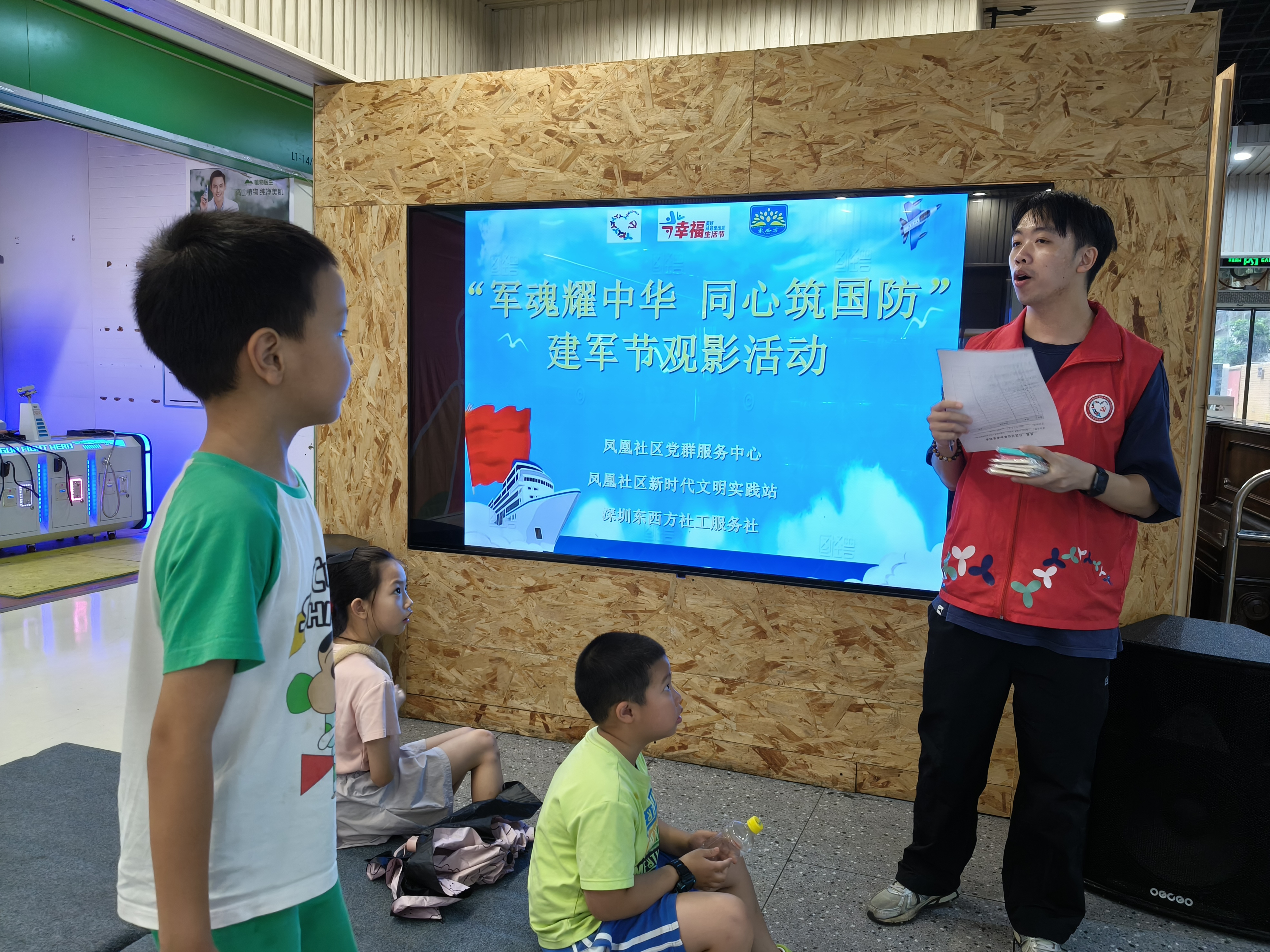 罗湖家园网讯:为庆祝中国人民解放军建军98周年,弘扬爱国主义精神,2025年8月1日,在凤凰社区党委统筹下,东西方社工服务社驻社区社工组织了建军节观影活动,吸引众多居民参与。