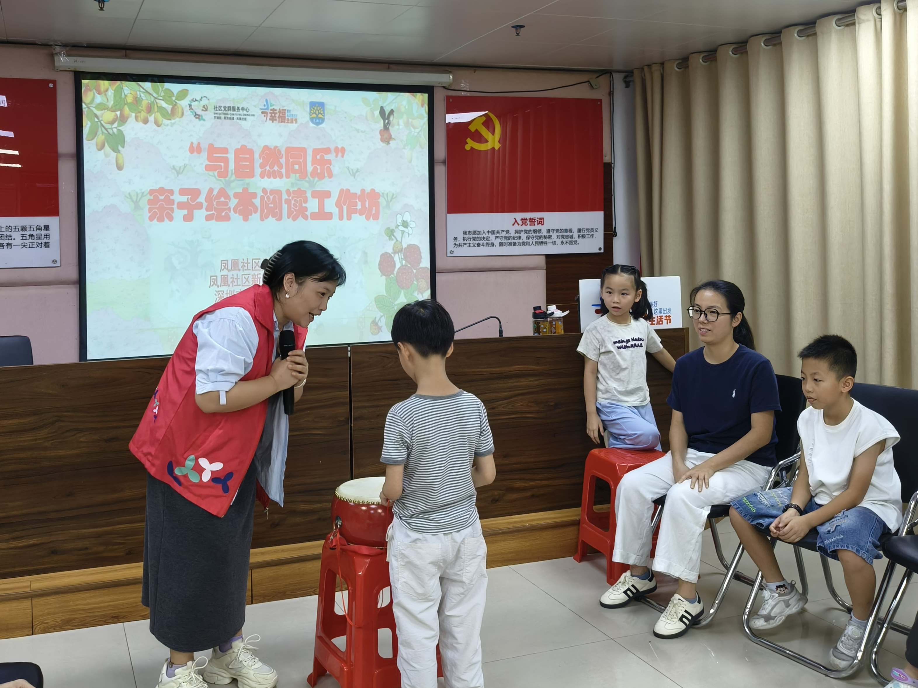 罗湖家园网讯:为丰富辖区儿童暑期生活,推动自然教育与亲子互动深度融合,8月17日下午,黄贝街道凤凰社区党群服务中心社工组织辖区亲子家庭,开展了“与自然同乐”亲子绘本阅读工作坊。12组5-8岁的亲子家庭通过 “阅读 + 模仿” 的沉浸式体验,开启了一场别开生面的夏日自然探索之旅。