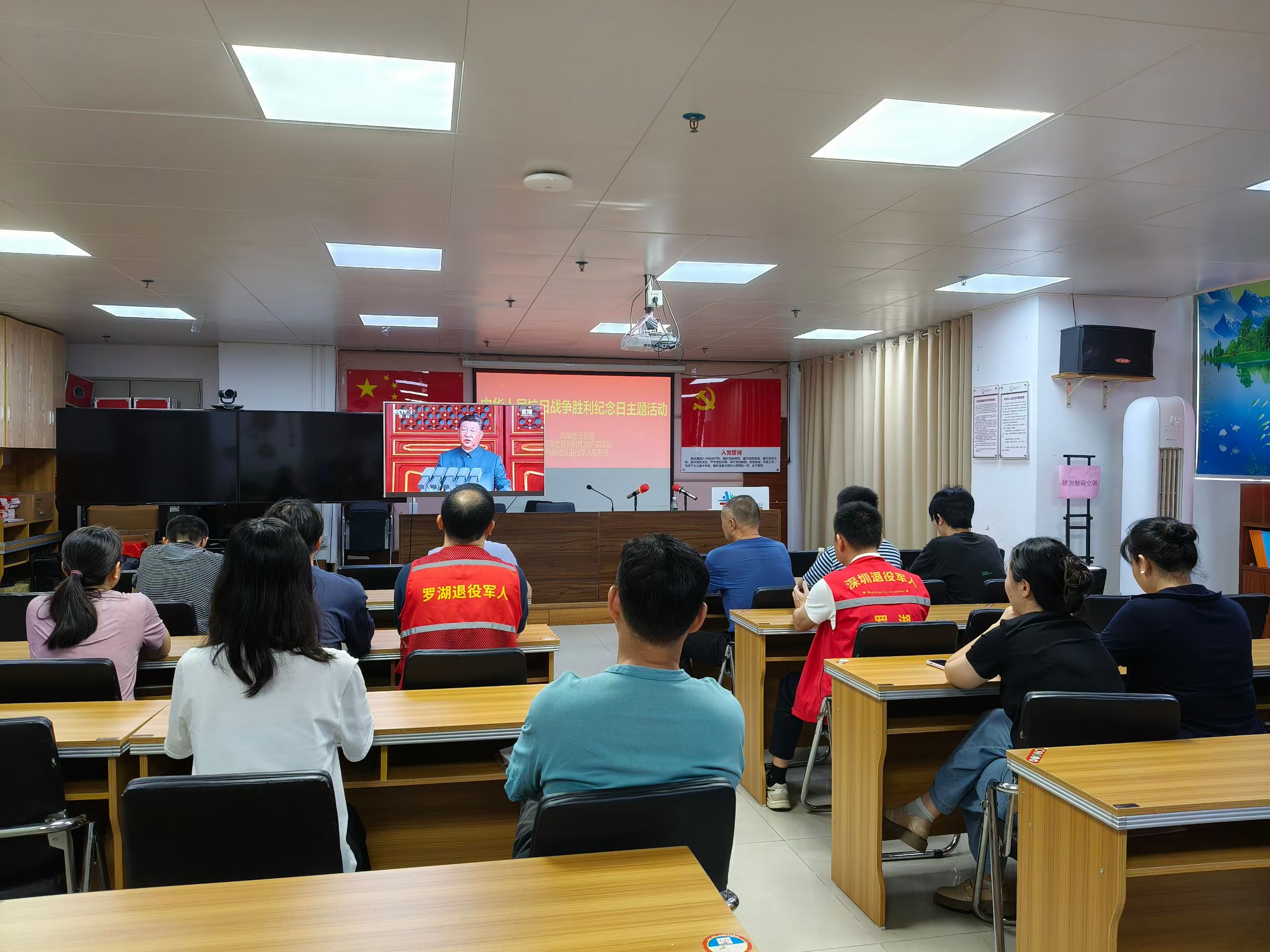 罗湖家园网讯:3日上午,纪念中国人民抗日战争暨世界反法西斯战争胜利80周年大会在北京天安门广场隆重举行。凤凰社区党群服务中心组织社区工作人员、退役军人、党员、居民群众在凤凰社区新时代文明实践站共同观看盛大的阅兵仪式,共同见证这一庄严时刻,激发了强烈的爱国热情和民族自豪感。