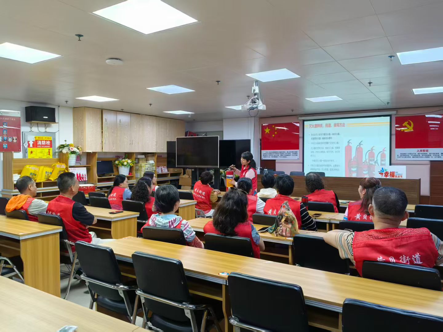 培训伊始,社工率先播放消防安全警示教育片。片中触目惊心的典型火灾案例、灾难场景与惨痛的事故后果,让在场志愿者直观感受到火灾的无情危害,深刻认识到消防安全的重要性,有效强化了全员安全防范的责任意识。随后,社工结合社区实际场景,详细讲解“119 报警需讲清地址、火情类型、被困人员数量及联系方式”的核心要点,并系统梳理火灾成因、分类、报警方法及初期扑救原则;为确保知识转化为实操能力,社工现场演示灭火器“提、拔、握、压”的标准使用步骤,逐一解读消防栓、防毒面罩等消防器材的功能用途及各类消防标志的含义;同时,针对性讲解烟雾环境下低姿弯腰、湿巾捂鼻、沿疏散指示标志逃生,以及被困时利用窗口呼救、挥舞明显物品等实用技巧,助力志愿者真正做到“听得懂、记得住、用得上”。