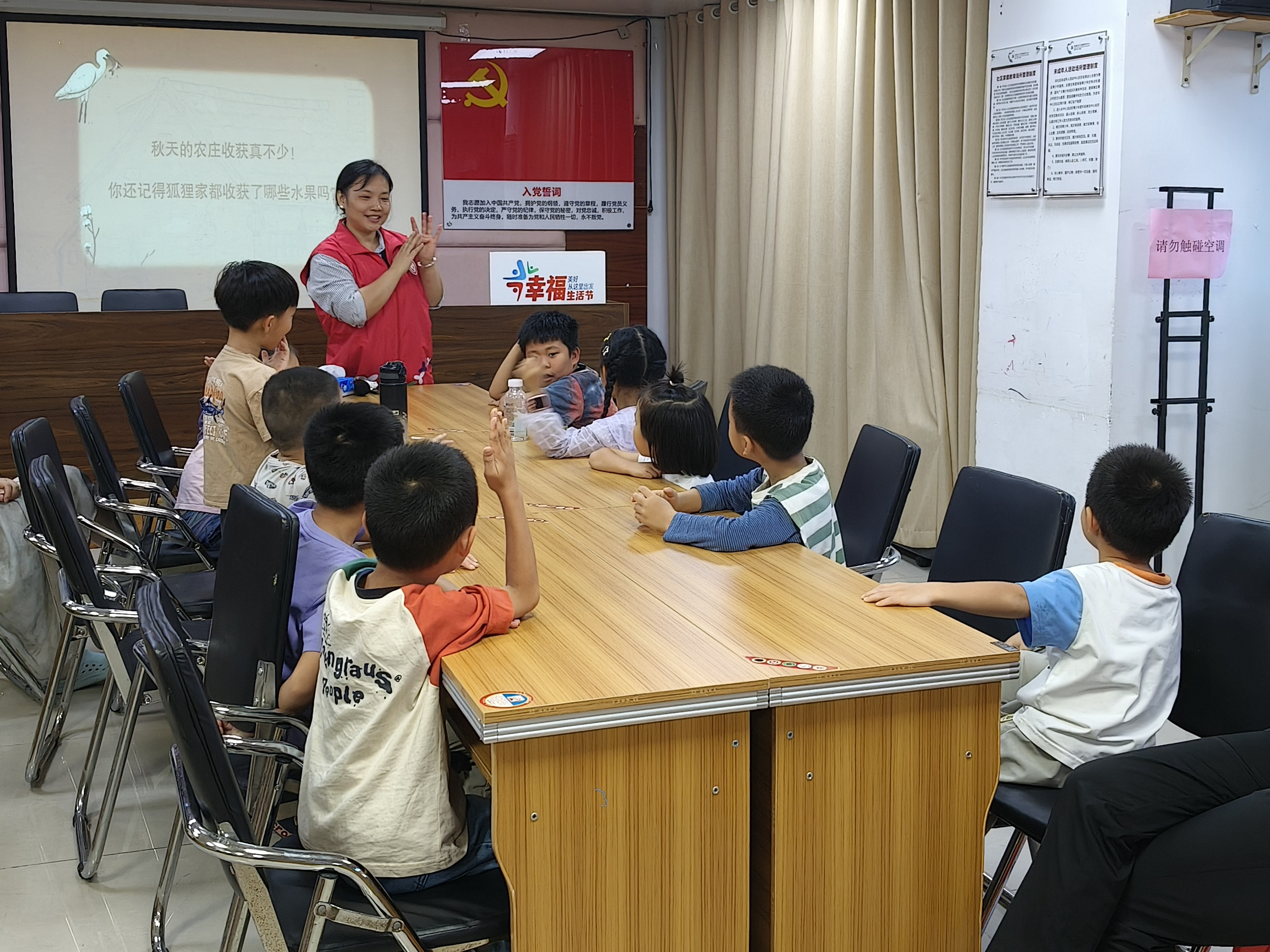 活动伊始,社工带领孩子们沉浸式阅读绘本《狐狸的自然劳动课》,生动讲述秋天的农场里瓜果飘香离不开农民伯伯的辛勤付出。引导孩子们了解田园劳作和二十四节气万物生长的秘密。绘本中鲜艳的果蔬形象深深吸引了孩子们的注意力,社工顺势发起互动,邀请小朋友们通过绘本中出现的水果蔬菜和现实生活相结合。“我喜欢吃葡萄和冬枣”“我妈妈做的莲藕排骨汤特别香”“我会用粘土做柿子” 小朋友们你一言我一语,在轻松交流中加深了对绘本内容的理解,也点燃了阅读热情。