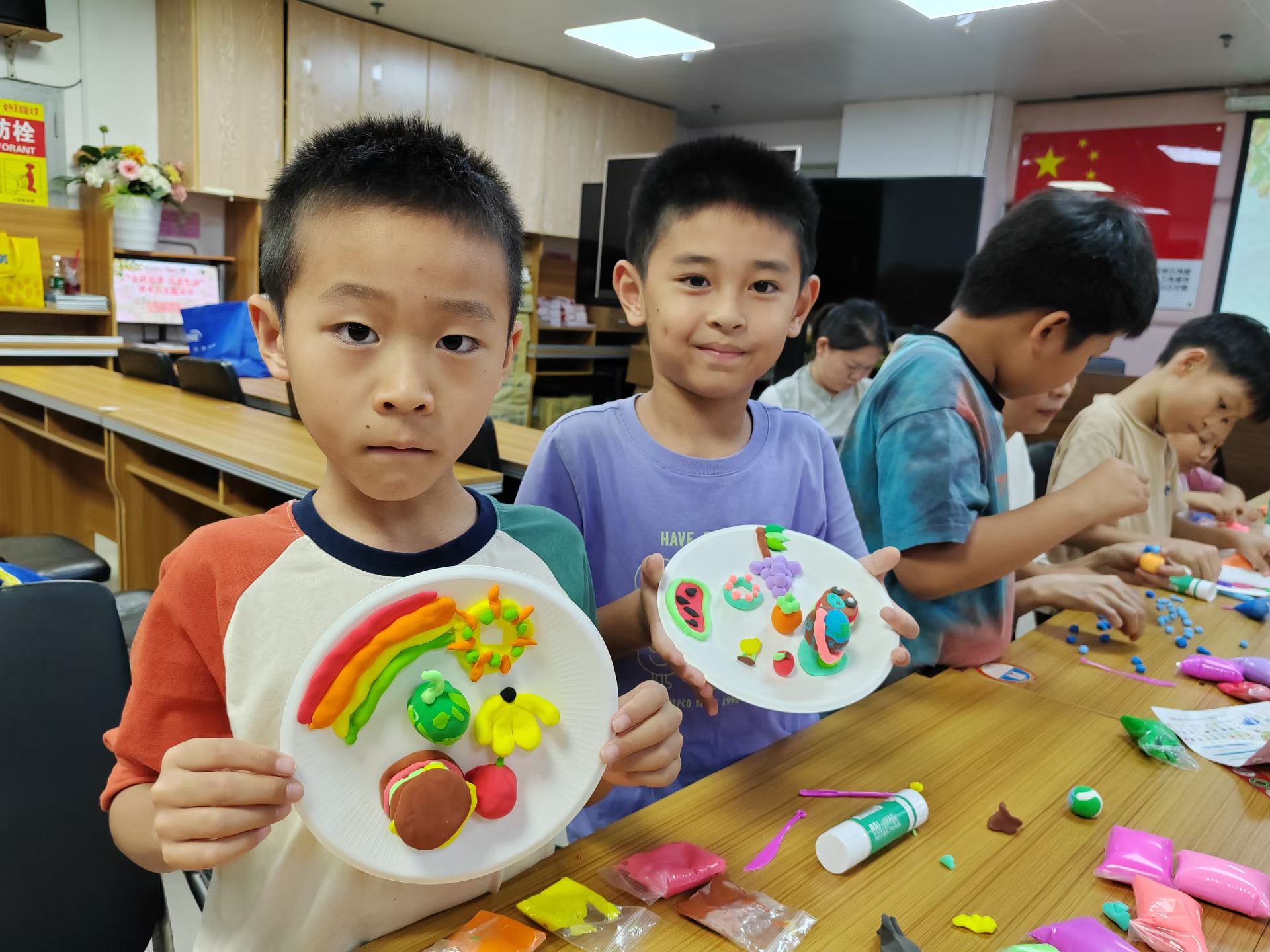 在手工创作环节,社工为孩子们分发各色粘土,详细演示基础塑形技巧,鼓励大家动手还原绘本中的果蔬形象。活动现场热闹非凡,有的小朋友紧跟教程,细致捏制出形态逼真的“水果”;有的则充分发挥想象力,大胆进行创意组合,用粘土搭配出独具个性的作品。孩子们的指尖翻飞,普通的粘土变成了一个个美味的水果蔬菜,脸上洋溢着成就感与幸福感。