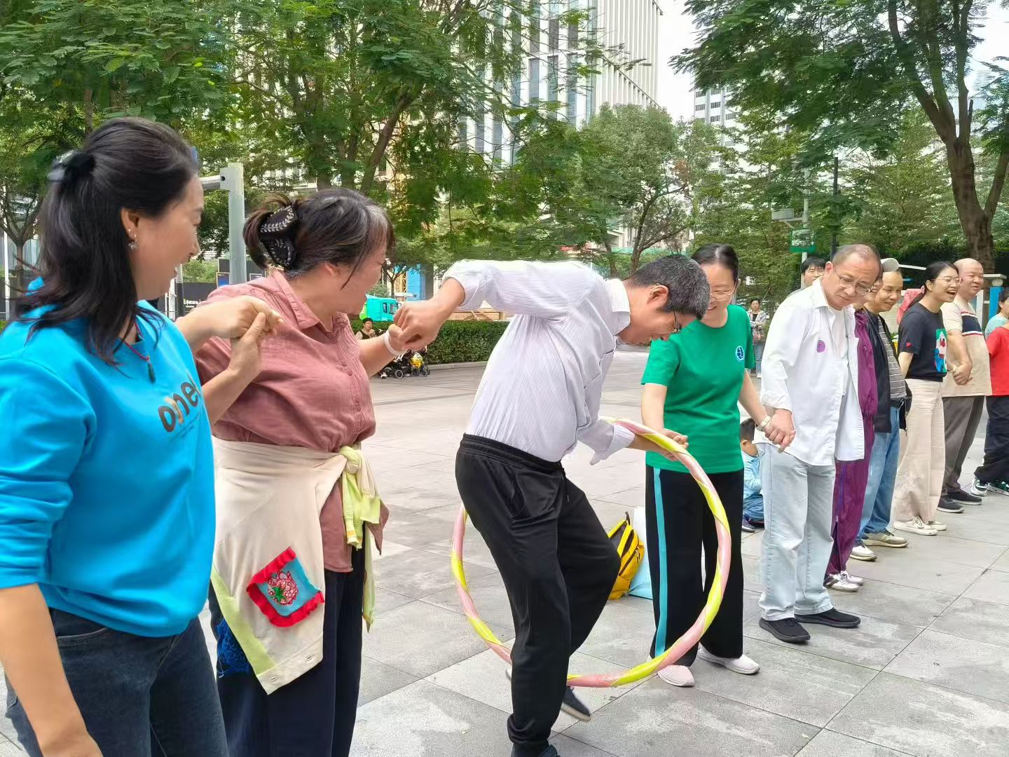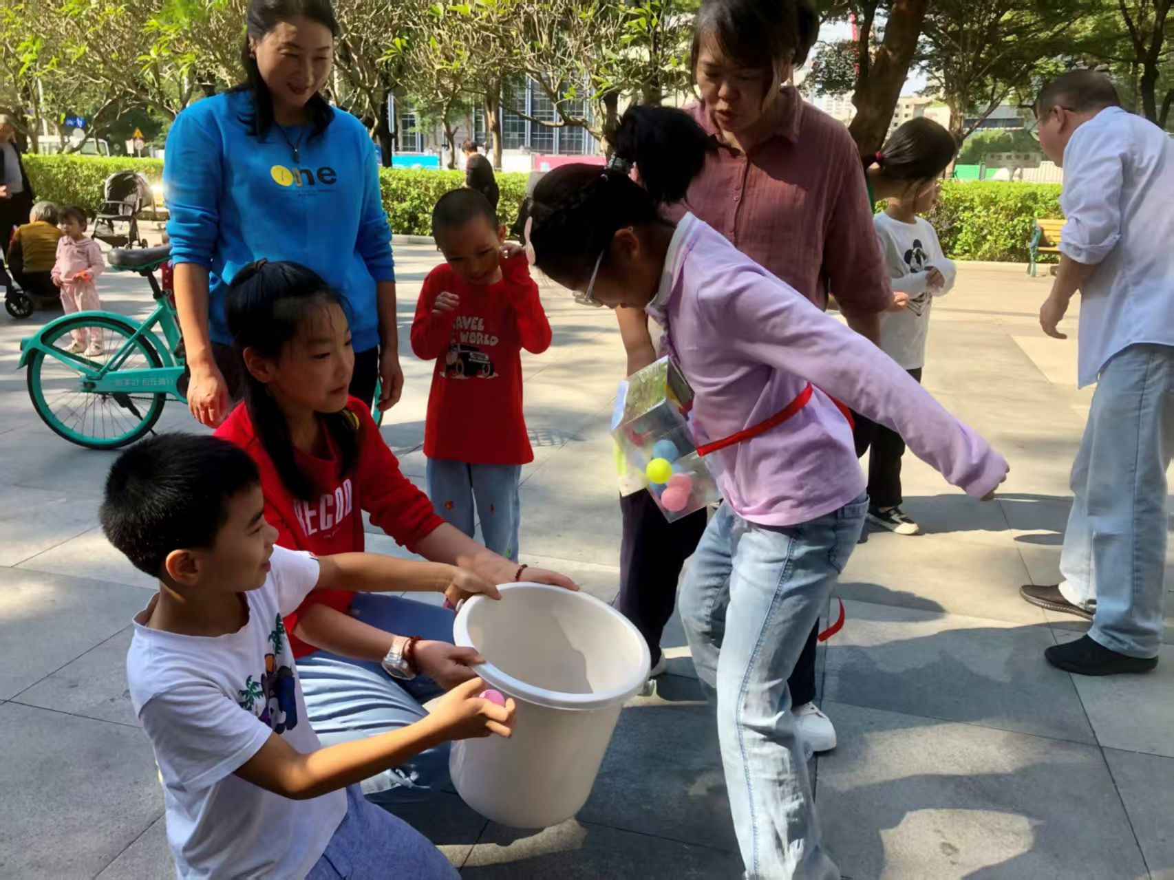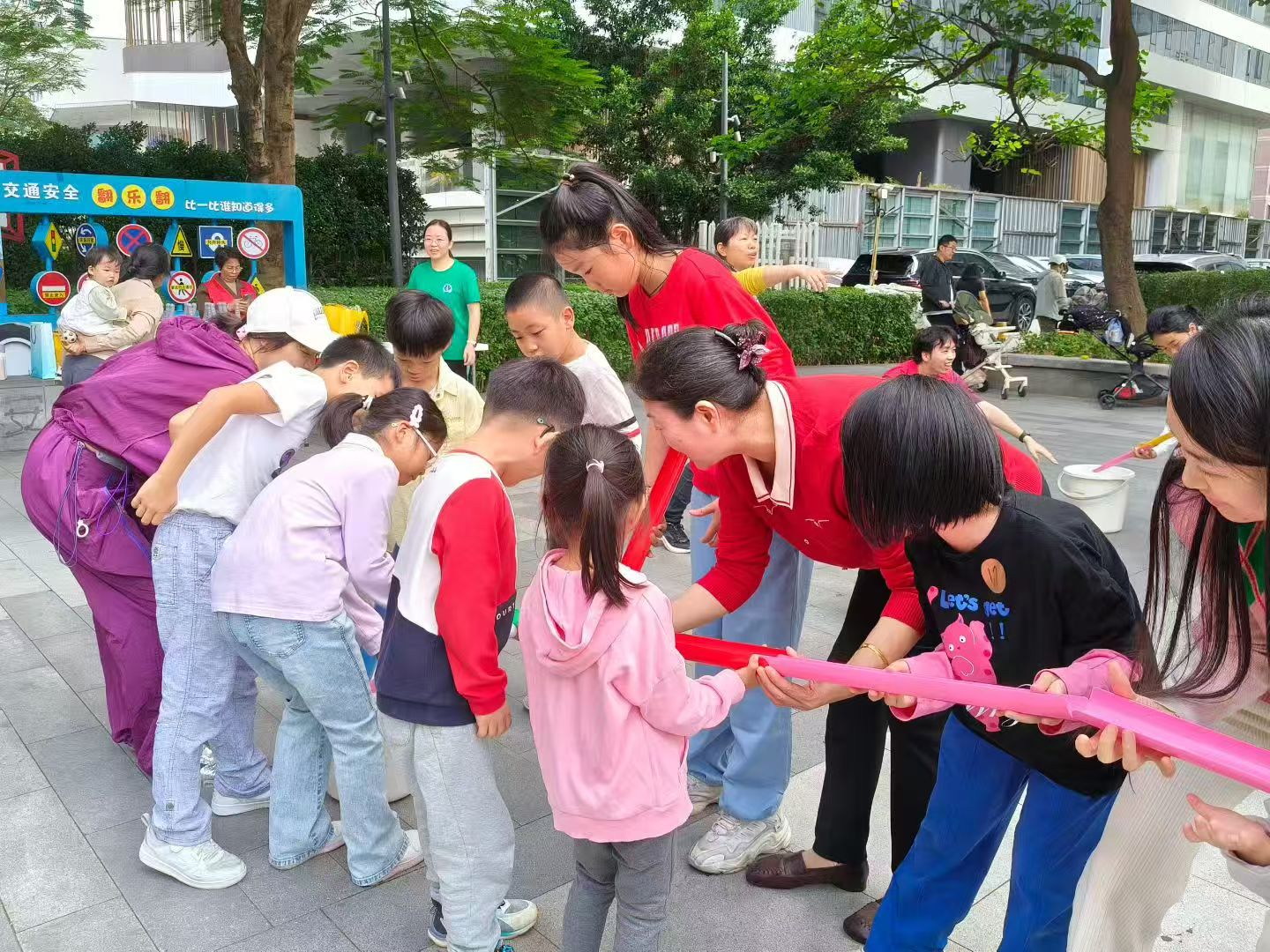 活动现场气氛热烈,“珠行万里”环节,家长与孩子手持管道默契配合,小心翼翼地将小球传递至终点,过程中不时响起阵阵加油声;“公鸡下蛋”项目里,参赛者腰间系着装满乒乓球的道具盒,通过跳跃、扭动等动作让球掉落,滑稽的姿态引得全场欢笑不断;“呼啦圈接力”时,亲子轮流传递呼啦圈,既要保持节奏又要相互配合,充分展现了协作的重要性。