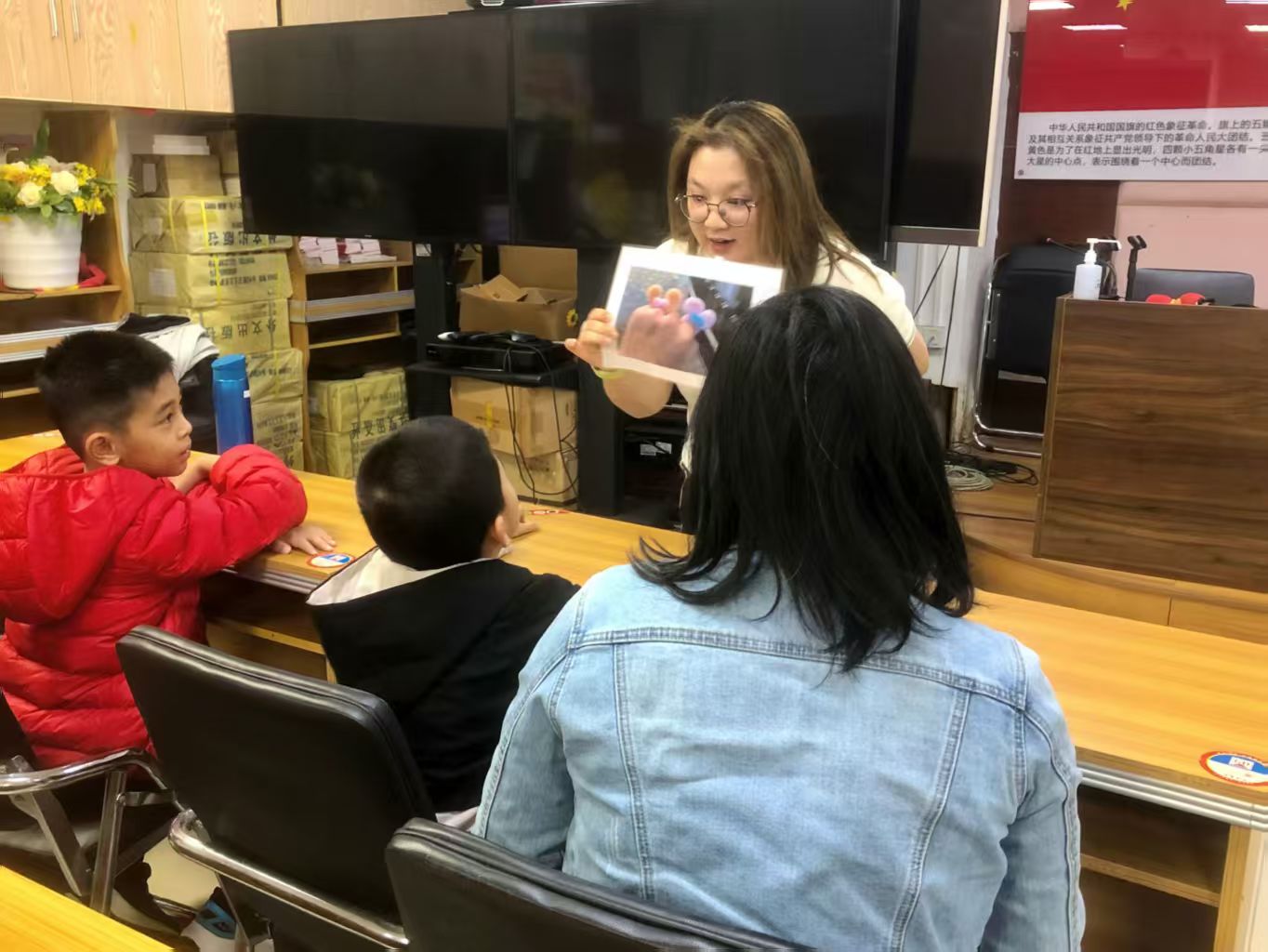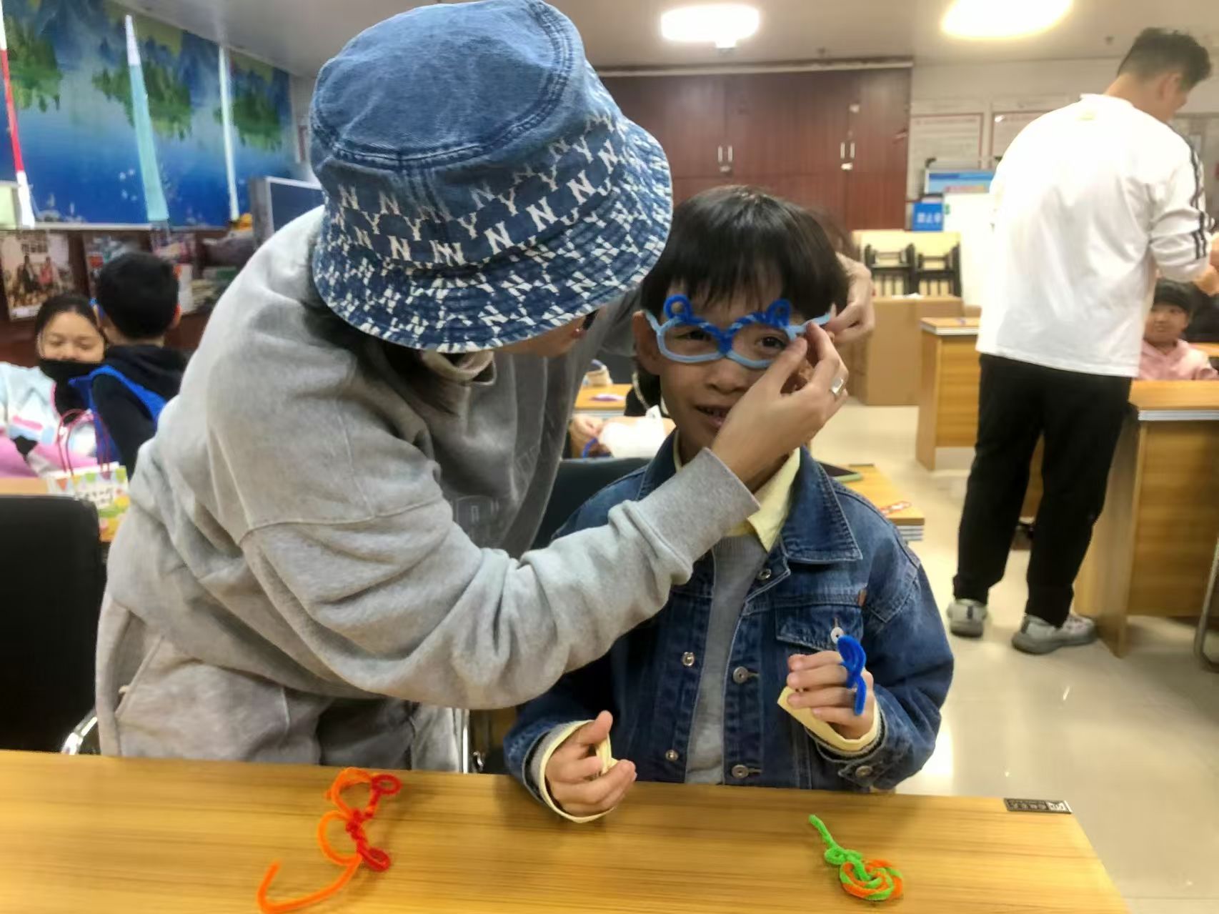 活动中,老师通过情景模拟、互动问答等生动形式,将“ring(戒指)”“bracelet(手环)”“lollipop(棒棒糖)”等贴近生活的英语单词具象化,让孩子们先理解含义、掌握发音。随后的亲子手工DIY 环节,孩子们手持色彩鲜艳的扭扭棒,在家长协助下,先跟着老师复现单词拼写与读音,再通过弯曲、缠绕、拼接,把“ring” 做成能套在手指上的迷你戒指,将“bracelet”编成长短合适的手环,把“lollipop”捏出带“棒棒糖”的立体造型。一个个灵动的手工制品,不仅让单词记忆变得直观有趣,更让孩子们在动手过程中加深了对词汇的理解,激发了创意表达。