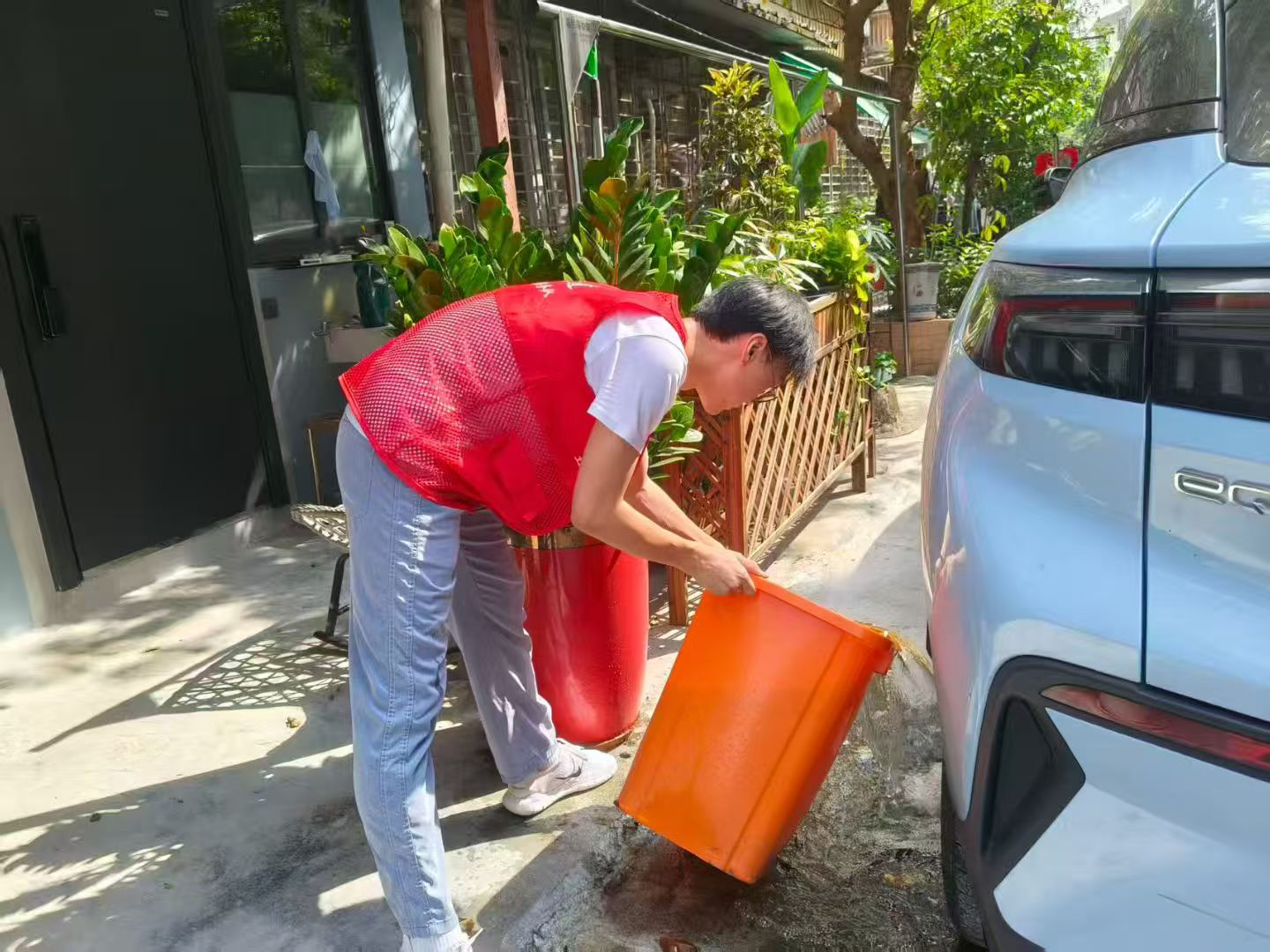 活动中,志愿者们以“清除滋生地、切断传播链”为核心目标,对辖区环境开展“拉网式”排查整治。从居民楼绿化带内的花盆托盘、废旧容器,到小区角落的积水沟渠、闲置轮胎,志愿者们逐一排查清理,累计清理积水点位10余处,整治卫生死角8个。同时,志愿者向居民发放《基孔肯雅热防控手册》100余份,现场讲解防蚊灭蚊技巧、传染病症状及应对措施,引导居民主动参与家庭卫生清洁,不少居民现场主动加入志愿队伍,共同参与环境整治,形成“全民参与防蚊”的良好氛围。
