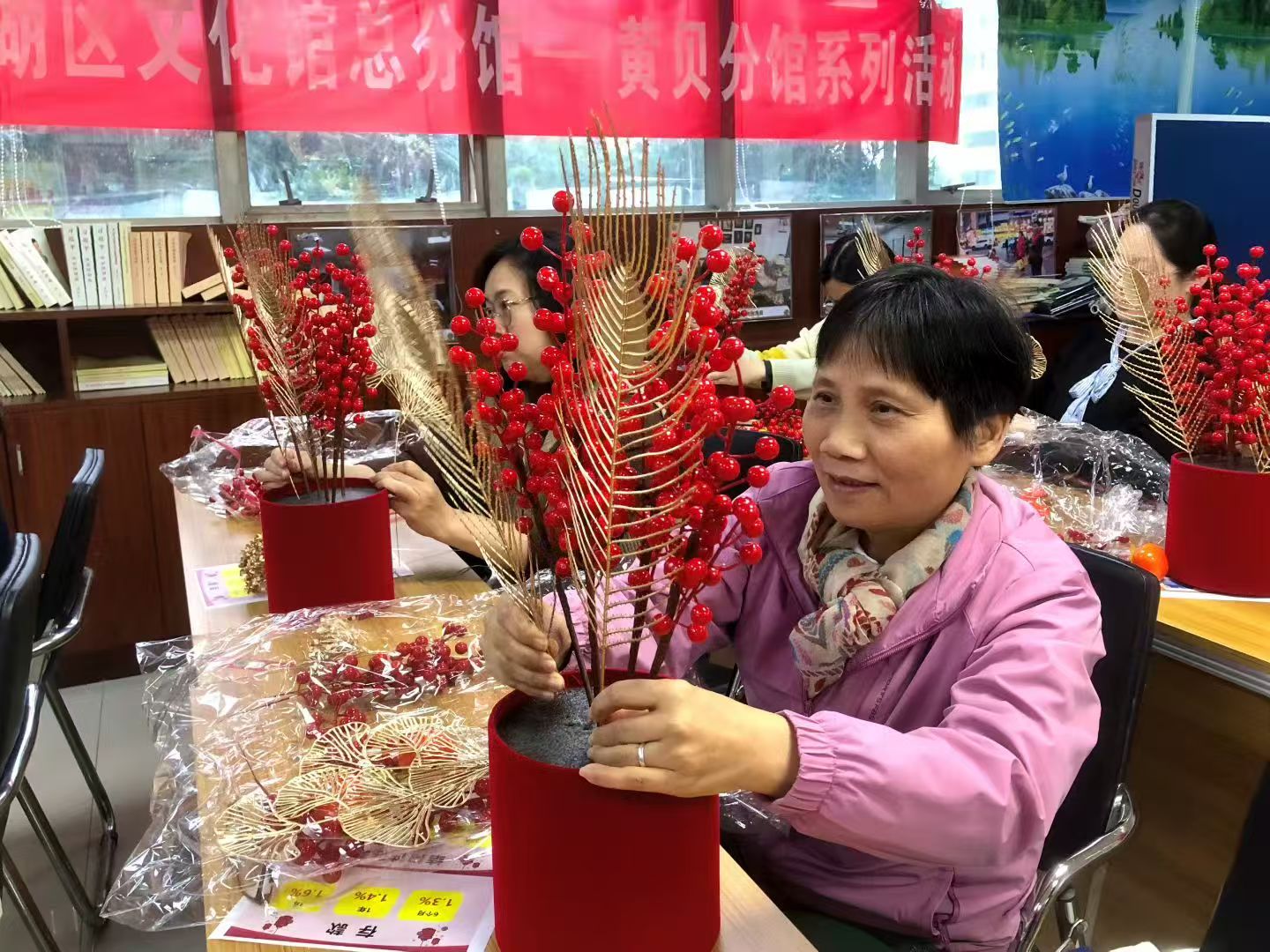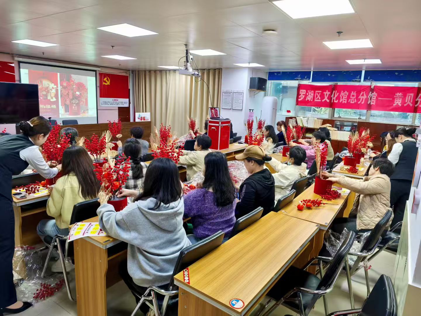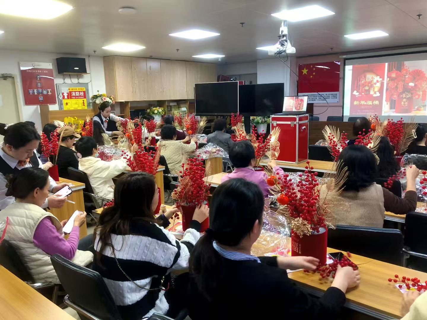 本次活动紧扣妇女群体的身心需求,以“手工创作+减压放松” 为核心主题,吸引了众多女性居民踊跃参与。活动现场,大家暂时抽离忙碌的工作与生活节奏,沉浸式投入到手工制作中。在灵巧的指尖翻飞间,大家专注于每一个细节,将对新年的期盼融入创作,原本普通的材料在她们手中逐渐变成一个个色彩鲜艳、寓意吉祥地抱福桶——饱满的花材象征岁岁平安,鲜红的装饰呼应元旦喜韵,精致的编结承载福运绵长。制作过程中,居民们相互交流心得、互帮互助,欢声笑语不断,在协作中增进了感情,也释放了日常积累的疲惫与压力。