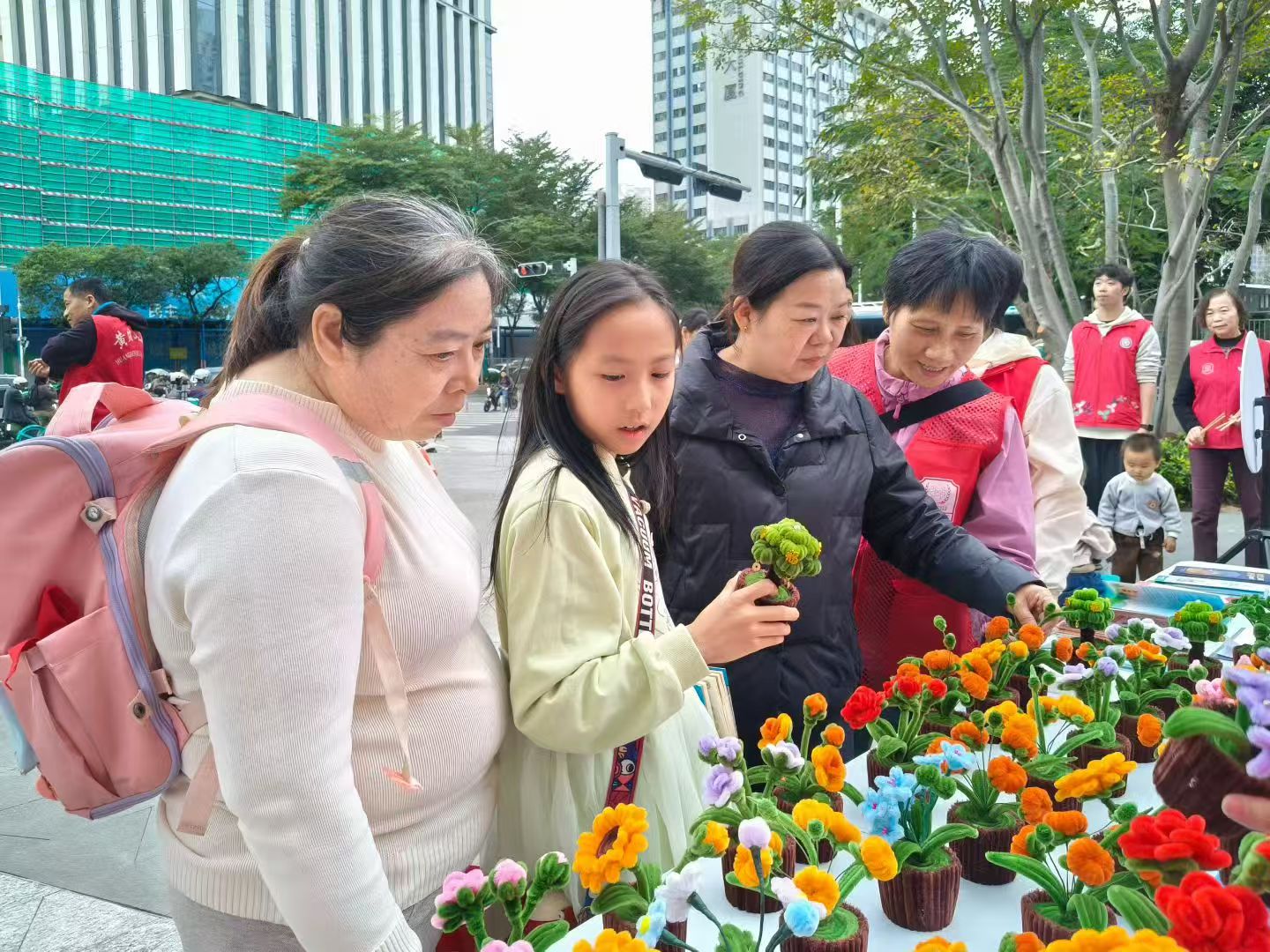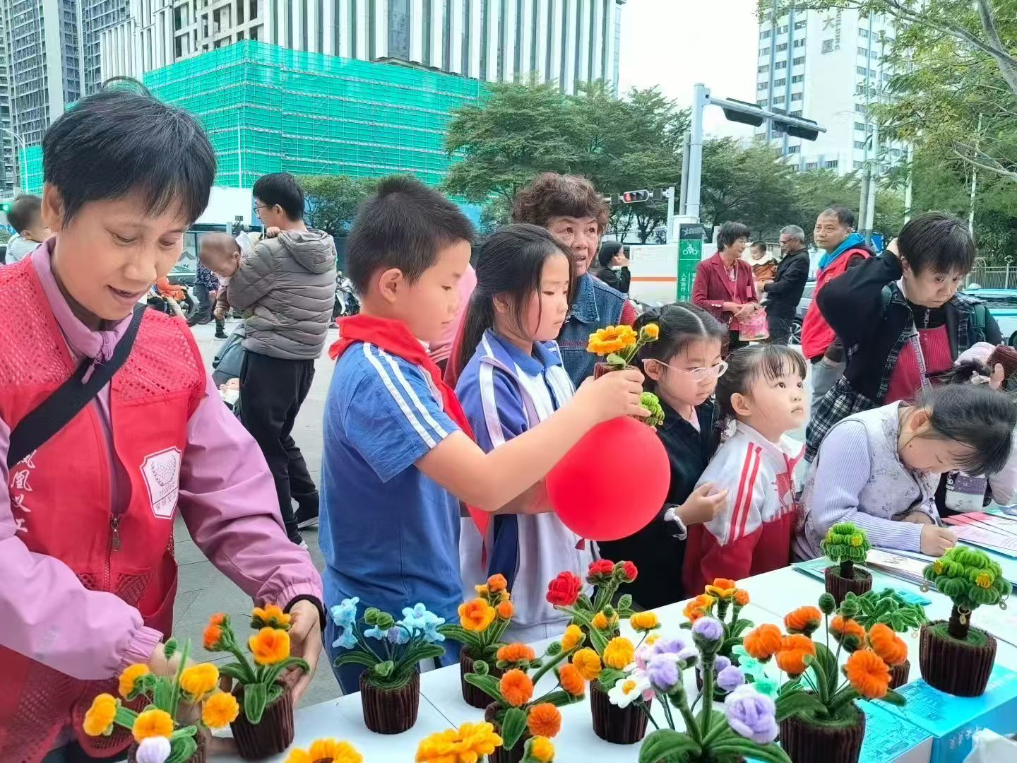 义卖区里,一排排扭扭棒手作盆栽整齐陈列。这些盆栽均由志愿者亲手制作,每一盆都承载着志愿者的用心与爱心。“这些扭扭棒小盆栽都是我们利用业余时间制作的,希望能通过义卖为需要帮助的人尽一份力。”现场志愿者介绍道。不少居民被这份真诚打动,纷纷驻足选购;更有居民主动交流手作技巧,在奉献爱心的同时收获乐趣与成长。