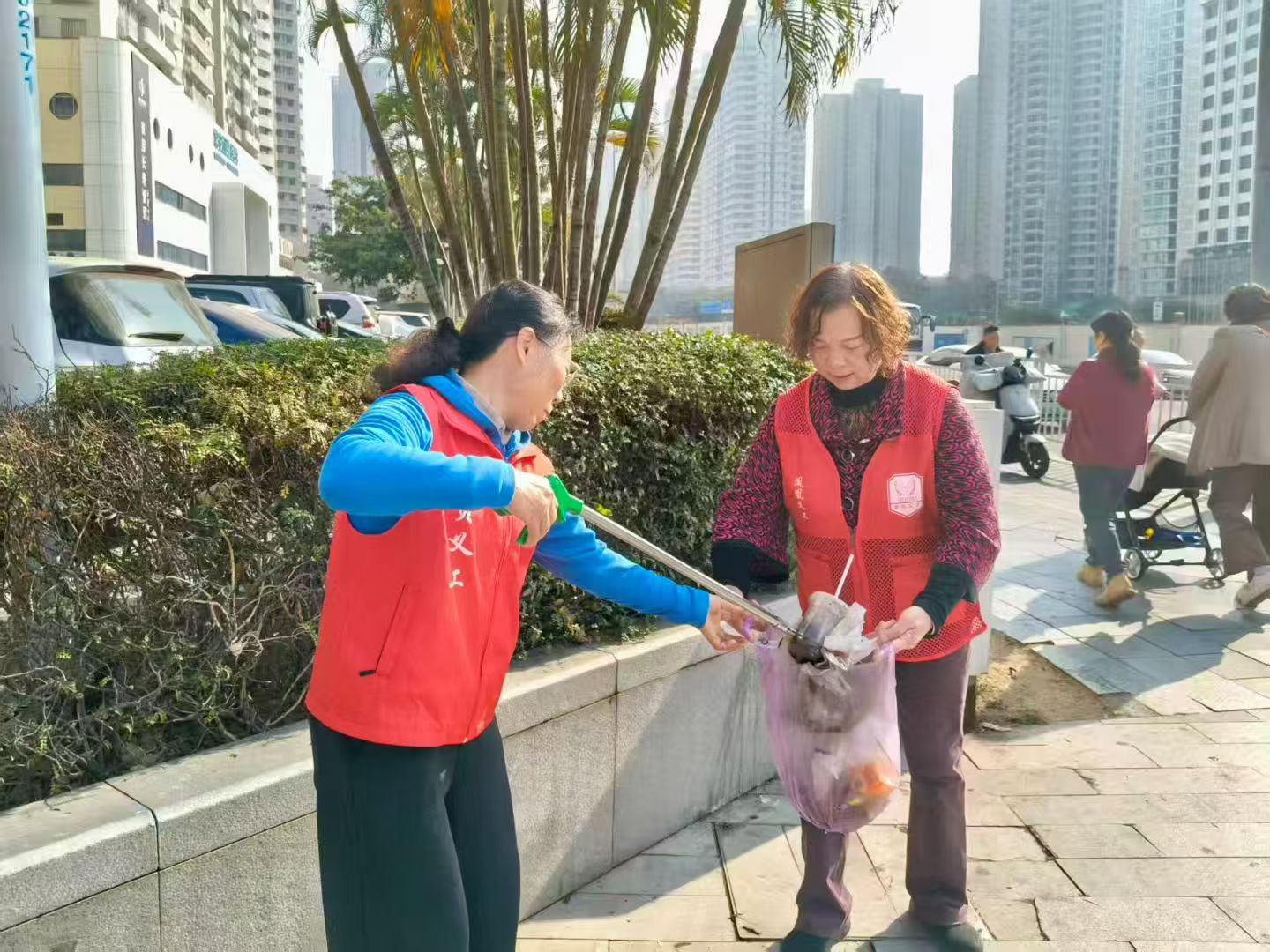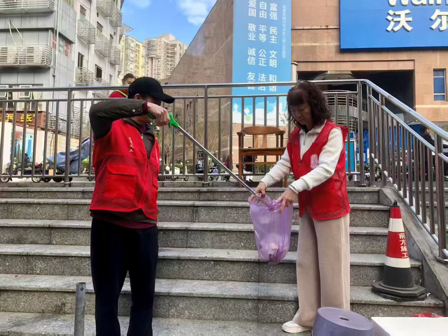 活动中,志愿者们组成巡查小队,带着垃圾夹、垃圾袋等工具,对社区主次干道、绿化带、广场、商铺周边等重点区域开展全方位巡查清理。大家分工明确,有的俯身捡拾隐藏在绿植中的烟头、纸屑,有的清理墙角杂物与卫生死角,同时向沿街商户、居民宣传环保知识,引导落实“门前三包”,主动参与环境共治。