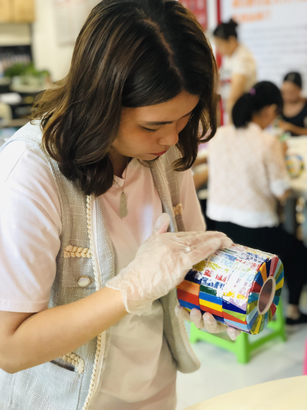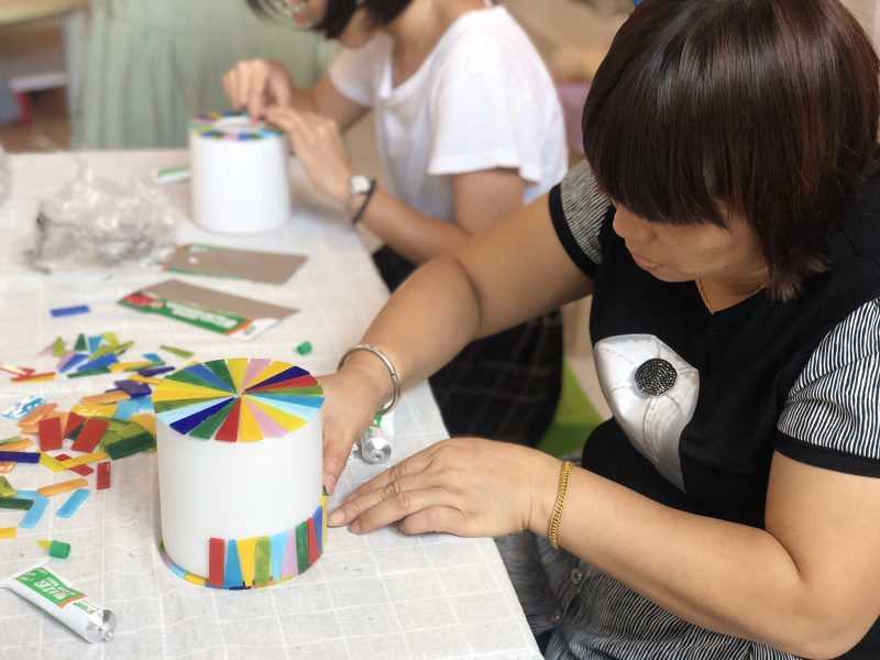本次活动主要运用各种色彩的蒂凡尼彩色玻璃进行拼贴组合。马赛克艺术材质广泛,但最受大家欢迎的还属彩色玻璃,它被运用到我们的生活中的各个方面,在国外的教堂窗户上运用得最为广泛,阳光透过彩色玻璃,呈现出七彩的光,被称为上帝之光,浪漫而圣神。活动中,原本普通的台灯,在居民们的装饰下变得缤纷五彩缤纷,充满了童话般的浪漫色彩。活动后,居民们对自己的作品都非常喜欢,这样一个即美丽又实用的马赛克艺术台灯为生活增添了不少颜值和快乐。热爱生活,热爱手作艺术,一起动手制作美丽物件,以此来装饰我们的家,让我们的家变得更加美丽,很好地诠释了本项目的核心理念。