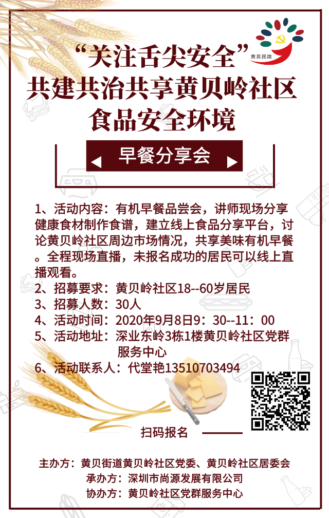 “关注舌尖安全”共建共治共享黄贝岭社区食品安全环境——早餐分享会活动内容:有机早餐品尝会,讲师现场分享健康食材制作食谱,建立线上食品分享平台,讨论黄贝岭社区周边市场情况,共享美味有机早餐。全程现场直播,未报名成功的居民可以线上直播观看。招募要求:黄贝岭社区18-60岁居民招募人数:30人活动时间:2020年9月8日9:30-11:00活动地址:深业东岭3栋1楼黄贝岭社区党群服务中心活动联系人:代堂艳13510703494报名方式:扫下方二维码报名