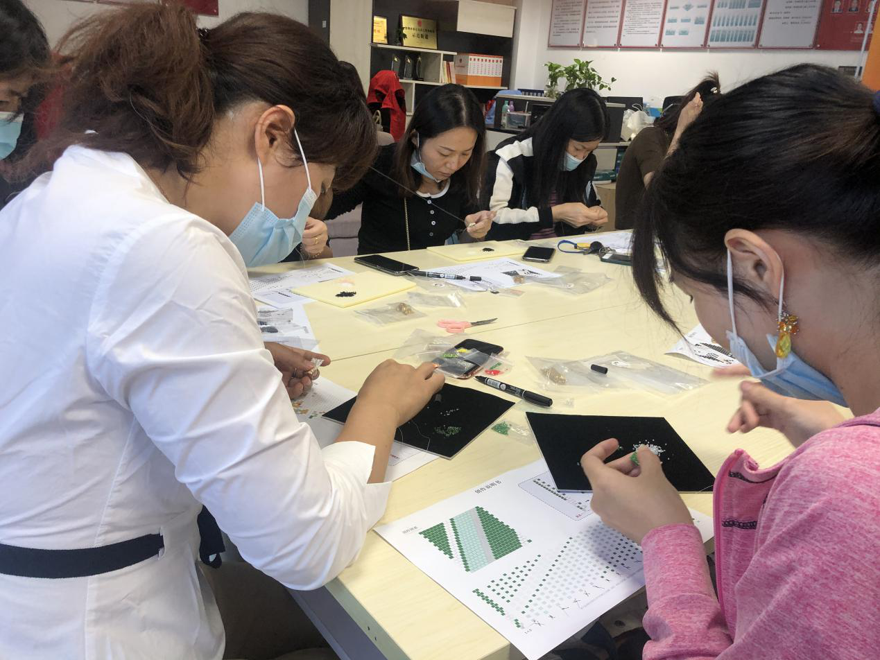 随着时代的发展,大家对美的需求越来越高。佩戴漂亮而适合自己的首饰品,成为女性生活的必需品,每个爱美的女性都希望自己能拥有几件独一无二的首饰品,以此更好的来展现自己的美。珠饰品精致而美丽,收到非常多的人喜欢。本次活动大家重点学习了仙人掌编织串珠手法,将原本一颗颗独立的进口玻璃珠,编织在一起慢慢地呈现出漂亮的花纹图案。很多居民还是第一次体验制作珠饰品。大家通过学习,从识图走针开始,到都能编织出漂亮的花纹,心里充满了成就感。