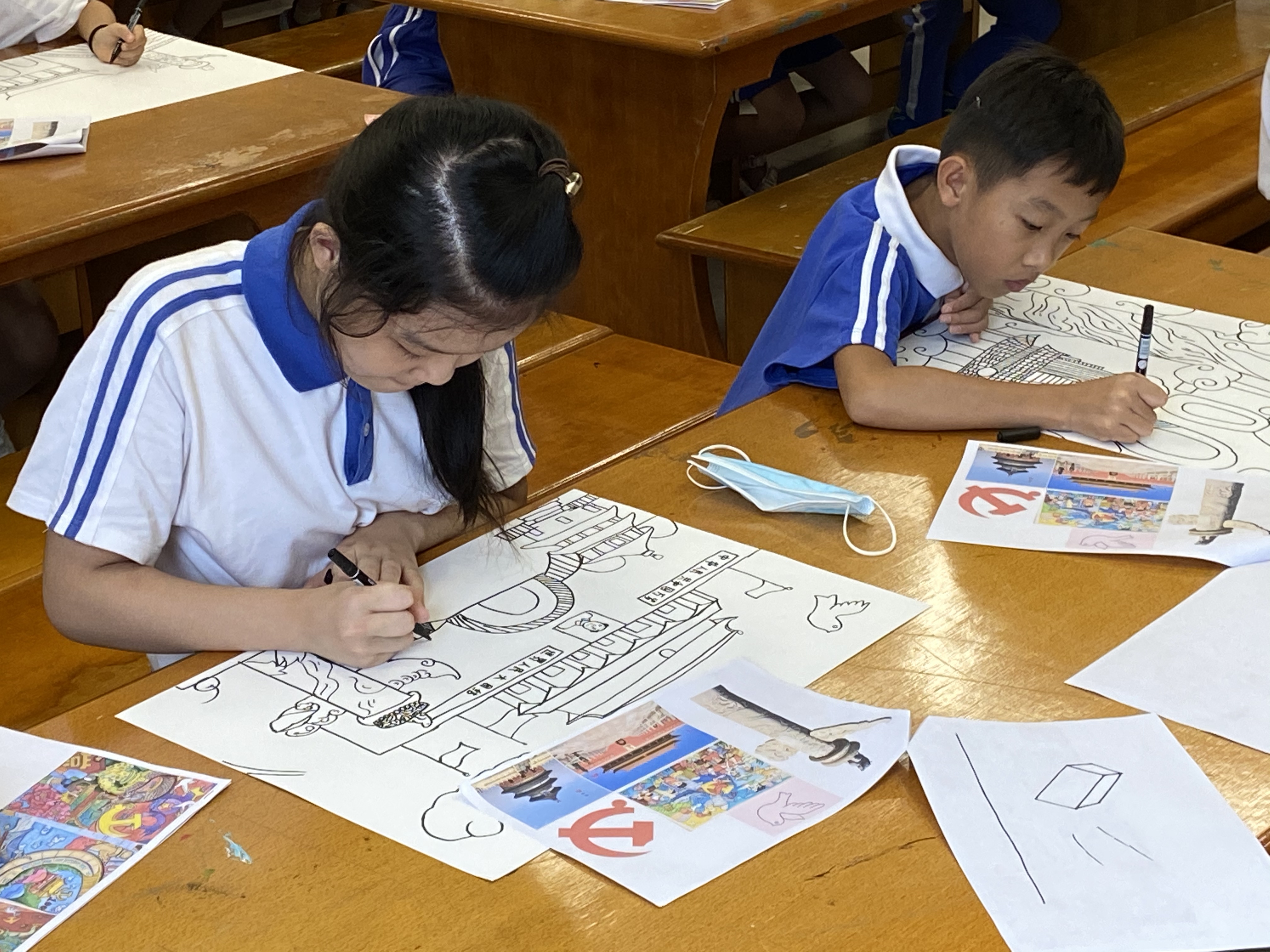 水墨画被视为中国传统绘画,也被称为国画,为了让大家后续课程更好掌握墨水、颜料等,第一节课老师带领青少年们先进行练习硬笔勾线做为基础功铺垫,学习如何合理用线表现对象,分辨画面主次关系,结合当下趣味性事物去突出主题,锻炼构图。今天来到第二节课,延续第一节课教学内容,大家将最终完成《100周年-大好山河》这副作品,青少年们根据自身对祖国的历史元素进行创作,有的画北京故宫,有的画庆祝中国共产党成立一百周年标志以及党徽等,最出众是有一名六年级的同学画了一副中国龙,盘旋在空中十足的霸气,展示出中国古代神话生物,老师也随之表扬大家的创作能力。
