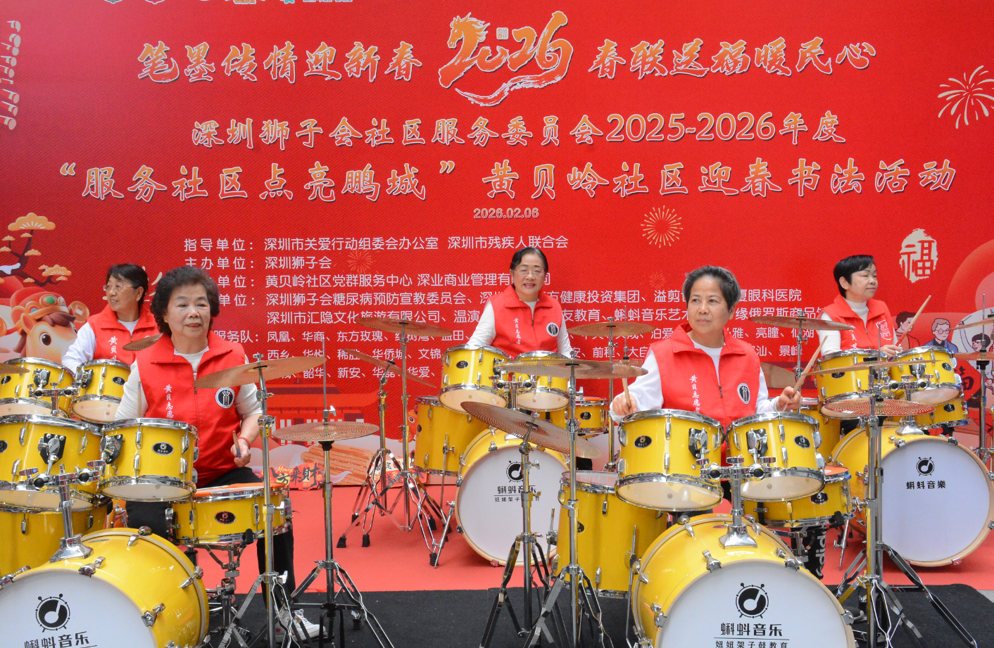 精彩的文艺表演为活动开启添一抹亮色。社区志愿者们带来了活力四射的架子鼓表演,激昂的鼓点如万马奔腾,又似惊涛拍岸,瞬间点燃了现场的气氛。活动现场,红纸铺展,笔墨齐备,深圳狮子会邀请书法家与社区书法爱好者即兴创作,或楷书端庄秀丽,或行书飘逸洒脱,一副副寓意吉祥的春联跃然纸上。“一帆风顺吉星到,万事如意福临门”等经典联句,承载着对新年的美好期许。居民们围在桌旁,一边欣赏书法创作,一边挑选心仪的春联,脸上洋溢着喜悦的笑容。“手写的春联更有温度,比印刷品更有年味!”居民张阿姨捧着刚写好的春联感慨道。