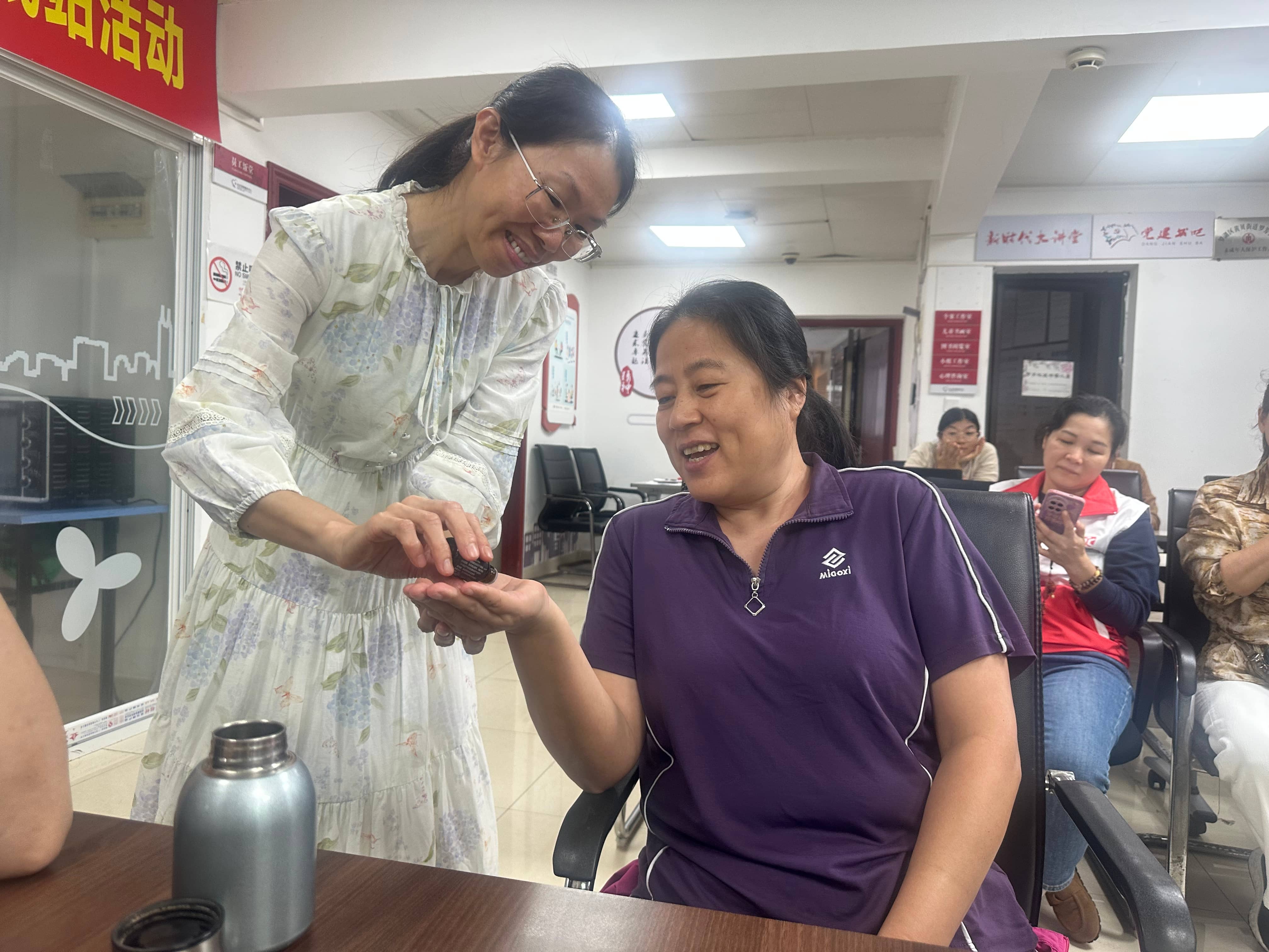 在“手掌嗅吸”体验中,长者亲身感受野橘与薄荷带来的情绪变化。野橘象征“招财”,涂抹时笑声不断;而深受鼻炎困扰的伍姐与张姐,则在嗅闻薄荷后表示“鼻子瞬间通畅”。导师还引导大家将一滴薄荷抵入上颚,瞬间神清气爽,现场氛围轻松而专注。