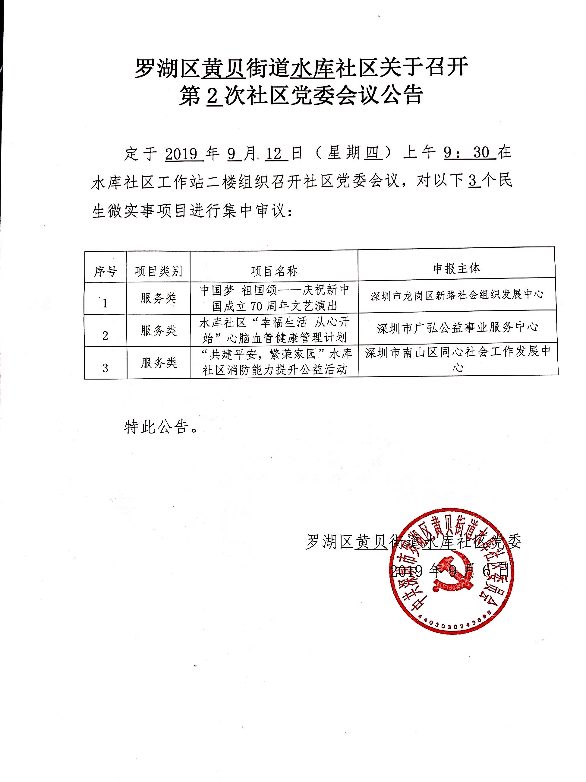 罗湖区黄贝街道水库社区关于召开第2次社区党委会议公告